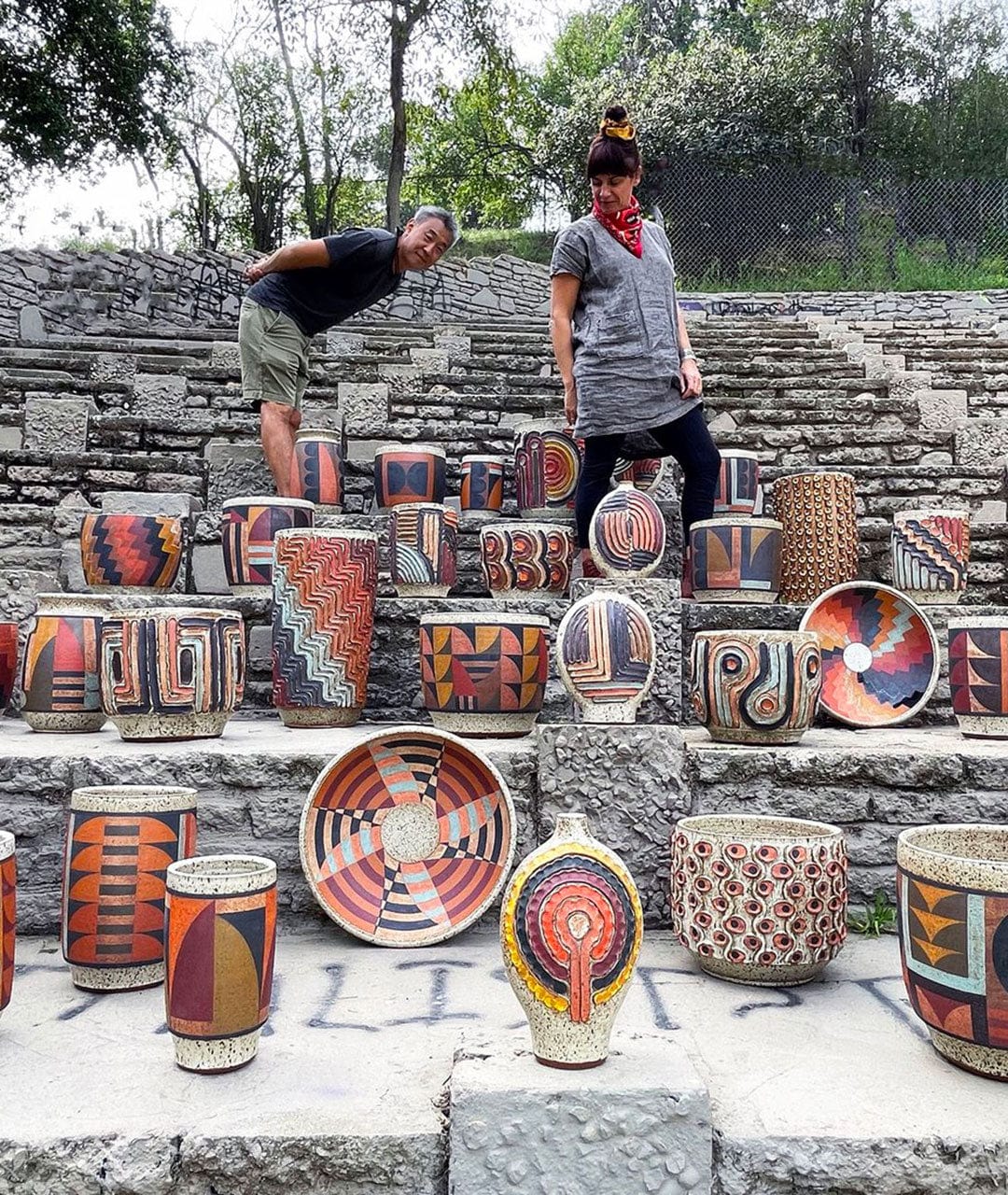 Kat and Roger, are a collaborative endeavor as partners and artists working in Los Angeles. Their work combines classic shapes and graphic surface patterns with earthy natural clay textures. They are influenced everyday by the California lifestyle and the vibrant city of L.A.