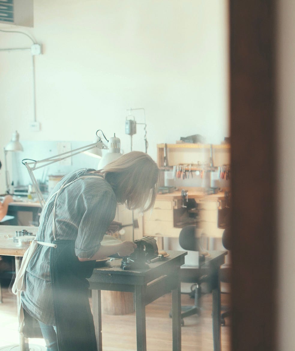 Sarah McGuire is a jewelry designer and metalsmith who draws inspiration from modernist design, organic forms, and man-made wonders. Sarah, originally from New England, collected artifacts and marveled at the scenery while on Connecticut's coast and traveling through Cape Cod, which would later influence many of her iconic jewelry designs. She lived in New York for more than ten years after earning her degree from Parsons School of Design, before relocating to Chicago.