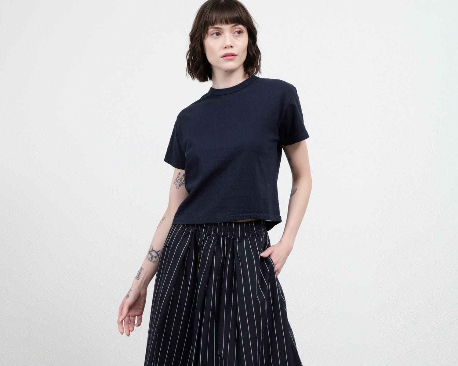Designed with a cropped boxy frame, the Hi'aka T-Shirt is made from Ochiwata Recycled Cotton and features a timeless ribbed collar. The slight cap sleeve adds a touch of femininity to the silhouette, while the relaxed fit and lack of side seams ensure both simplicity and comfort. This versatile tee is perfect for layering or wearing on its own, making it a must-have basic.