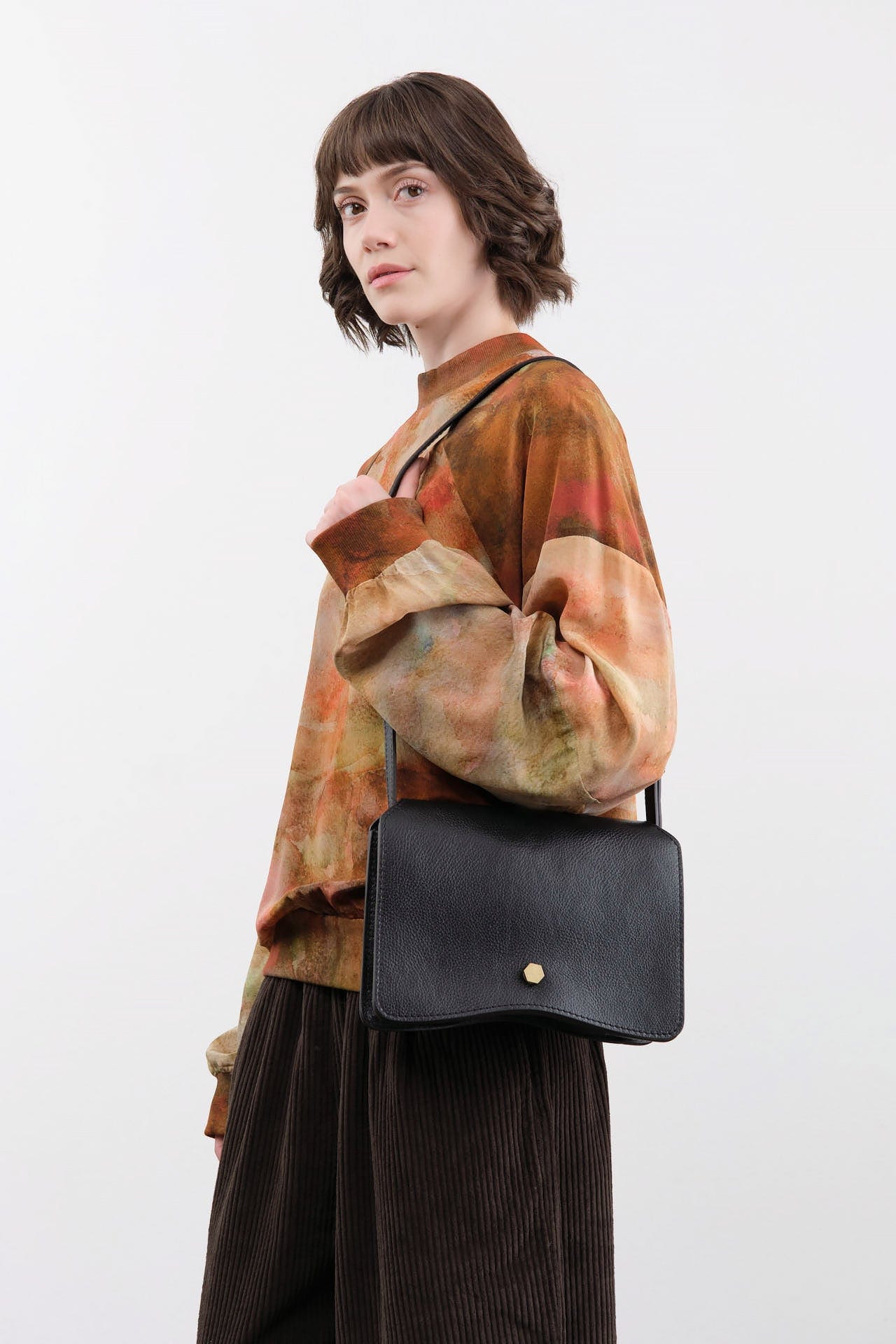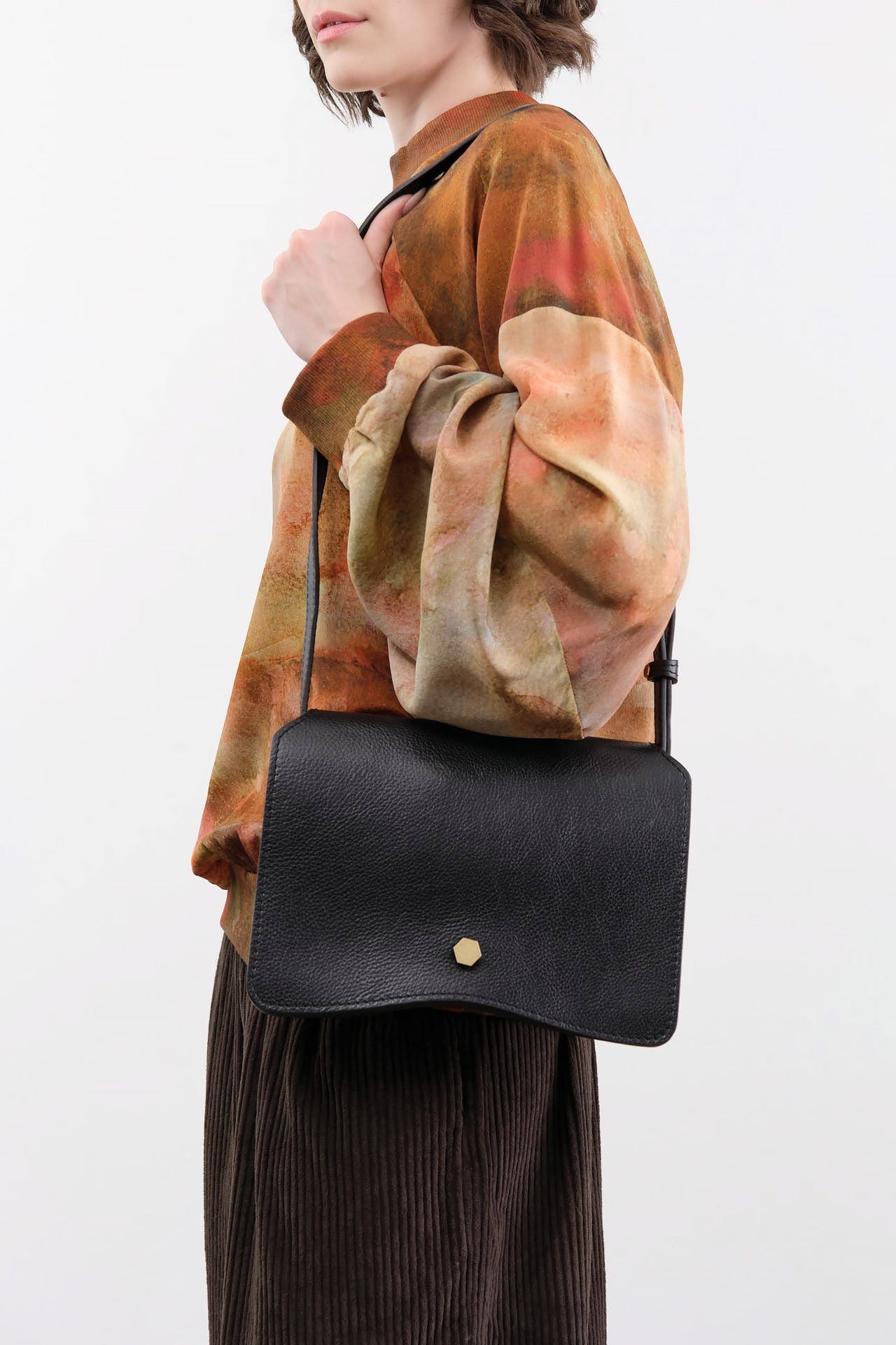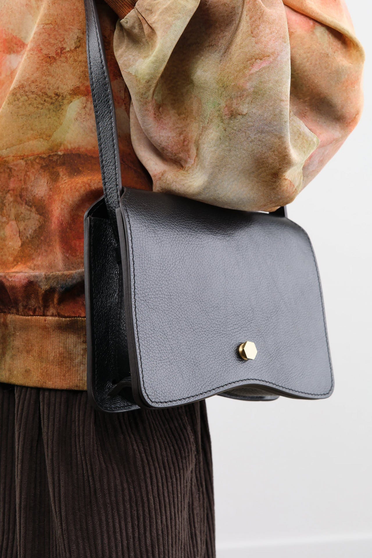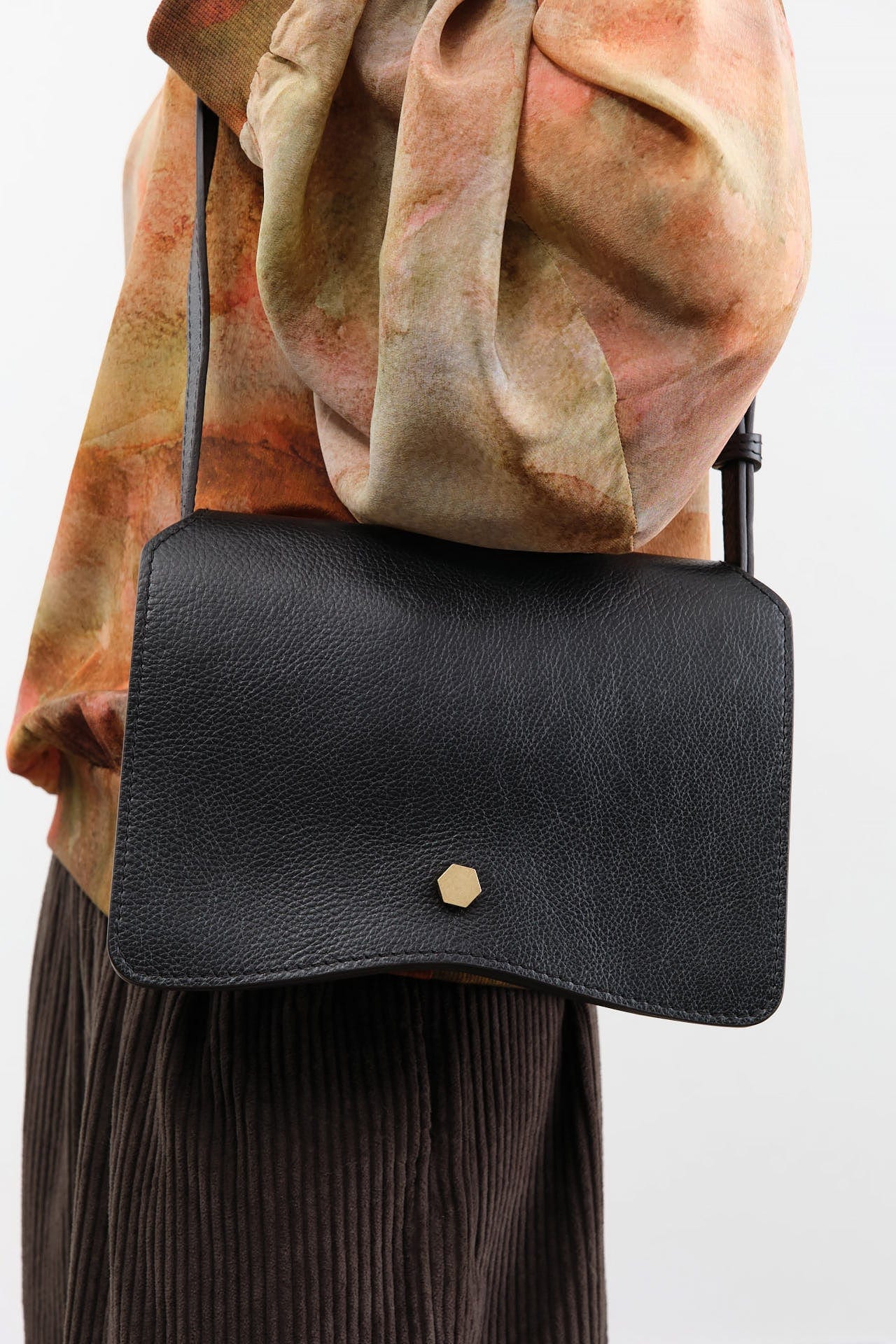 The Val Bag is a sophisticated crossbody that elevates the traditional book bag with its sleek modern lines and elegant curves, hallmark features of the Lindquist design. This versatile accessory features three spacious interior compartments, secured by a cover flap with custom solid brass hexagonal hardware. The minimalist winged bottom edge adds a unique touch, while the adjustable strap with a solid brass buckle allows for customizable wear. With five interior card pockets and a convenient 6" zipper pocket, the Val Bag is the perfect blend of functionality and modern style.