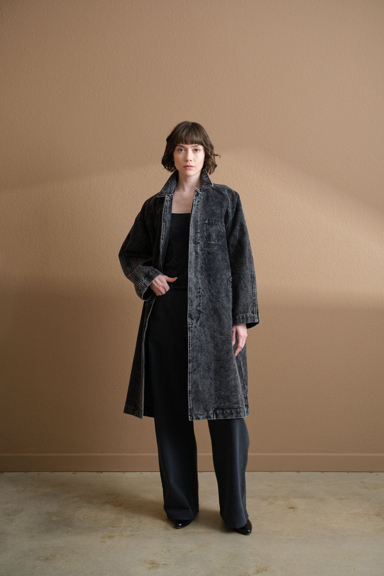 The Fall Duster is a beautifully tailored mid-length coat that combines sophistication with comfort. Featuring a stylish pointed collar and a straight hem, this duster boasts a boxy fit that flatters all body types. The concealed placket offers a sleek finish, while raglan sleeves provide ease of movement. With two front side pockets, it seamlessly blends practicality with elegance, making it the perfect addition to your wardrobe.