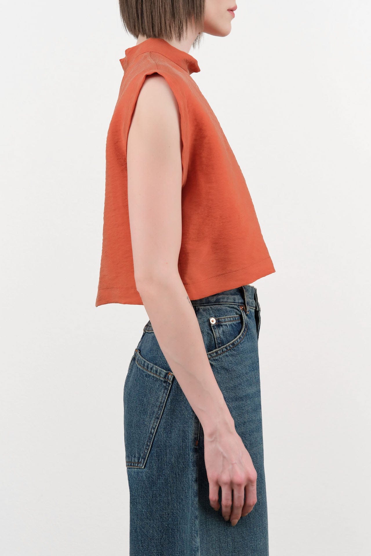 The Bacchus Top is a chic and modern piece that combines comfort with sophistication. Made from a lightweight rayon blend, this boxy cropped top features a relaxed silhouette and a mock neck design. The slight cap sleeve effect and rich terracotta hue add further touches of femininity, alongside the contemporary cut.