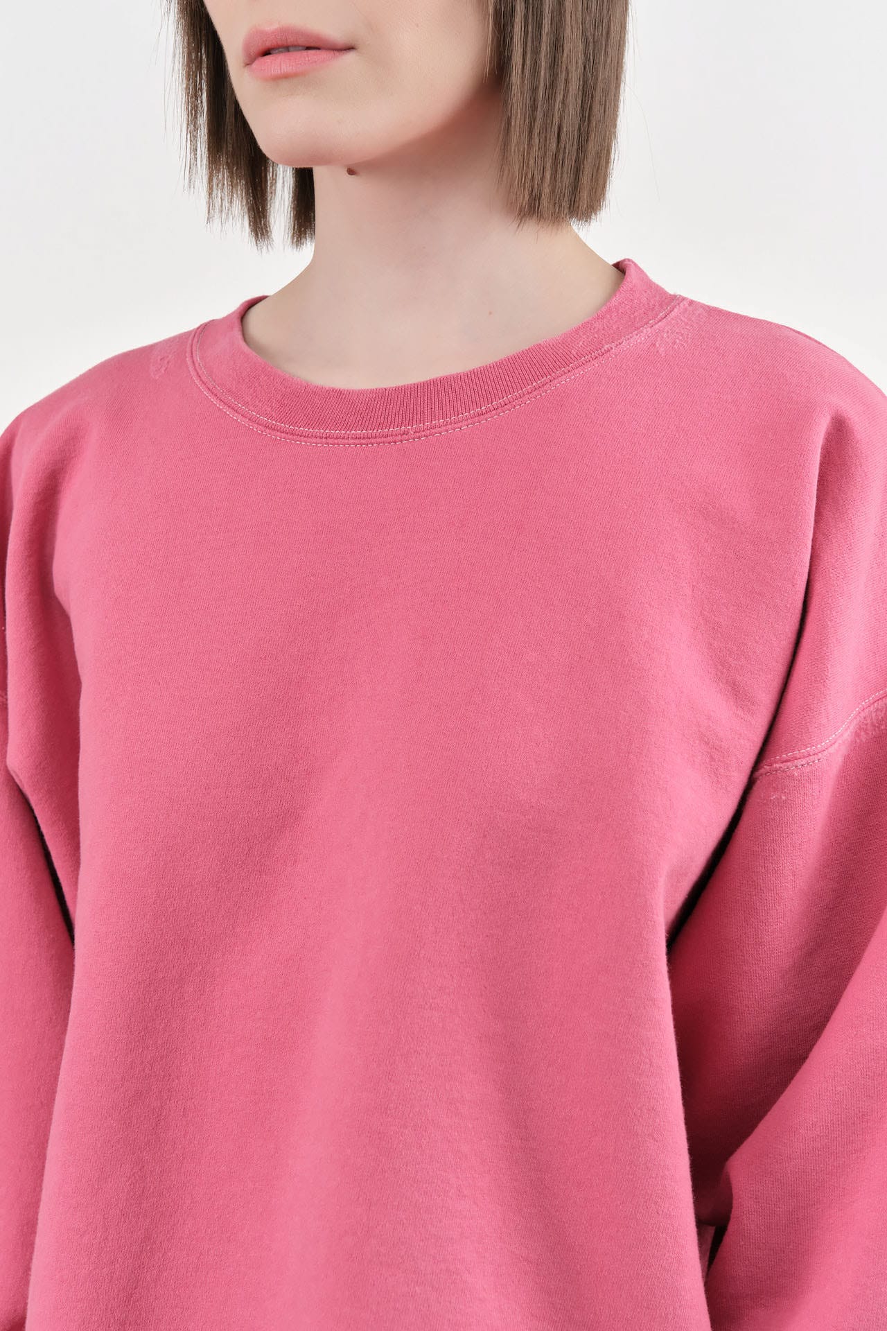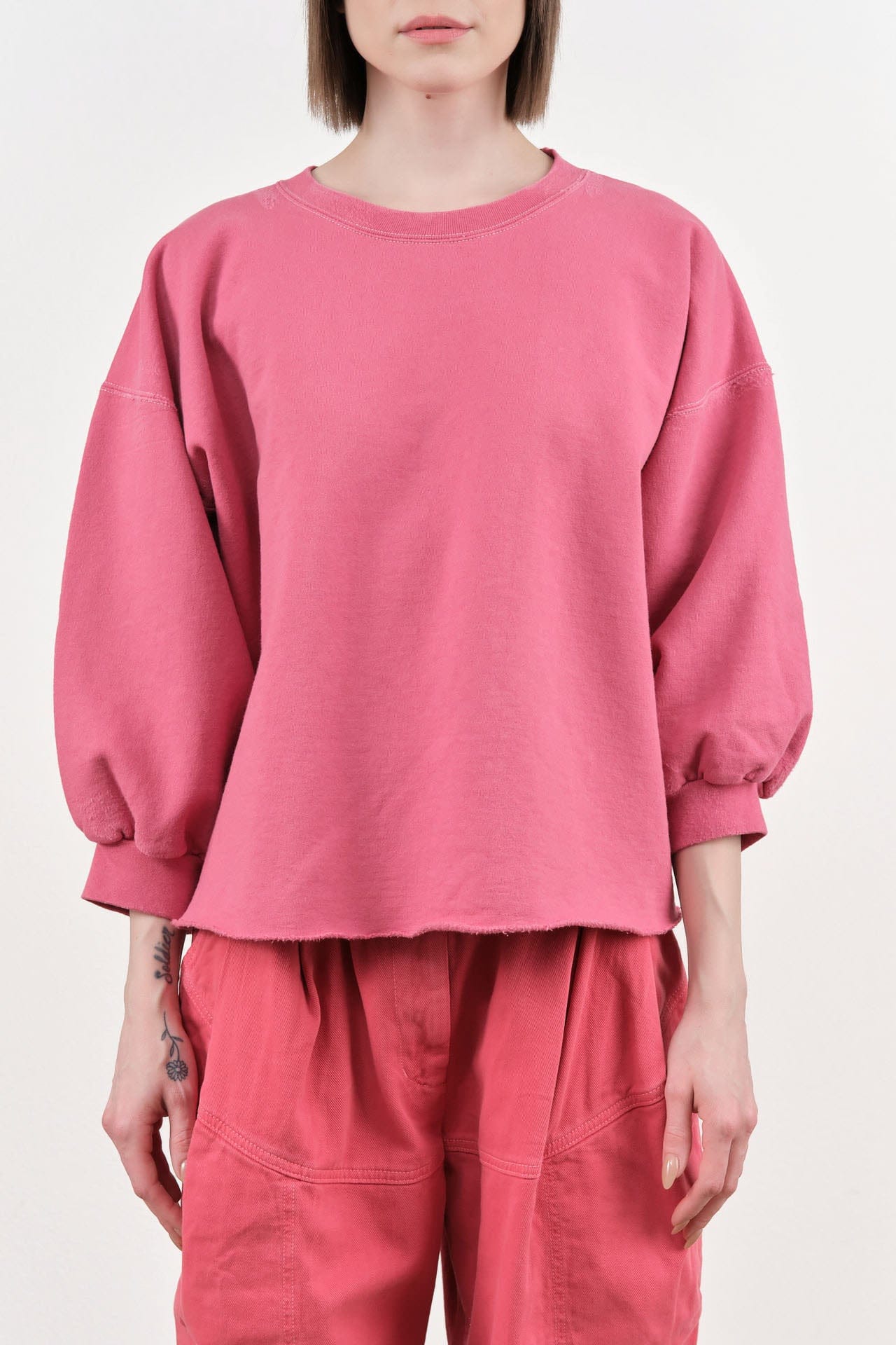 The Fond Sweatshirt is a must-have, featuring a timeless crewneck design with a modern twist. This sweatshirt offers a unique and stylish look with its drop shoulders, cropped sleeves, raw edge hemline, and distressed details. In a washed red hue that is perfect for transitional seasons.