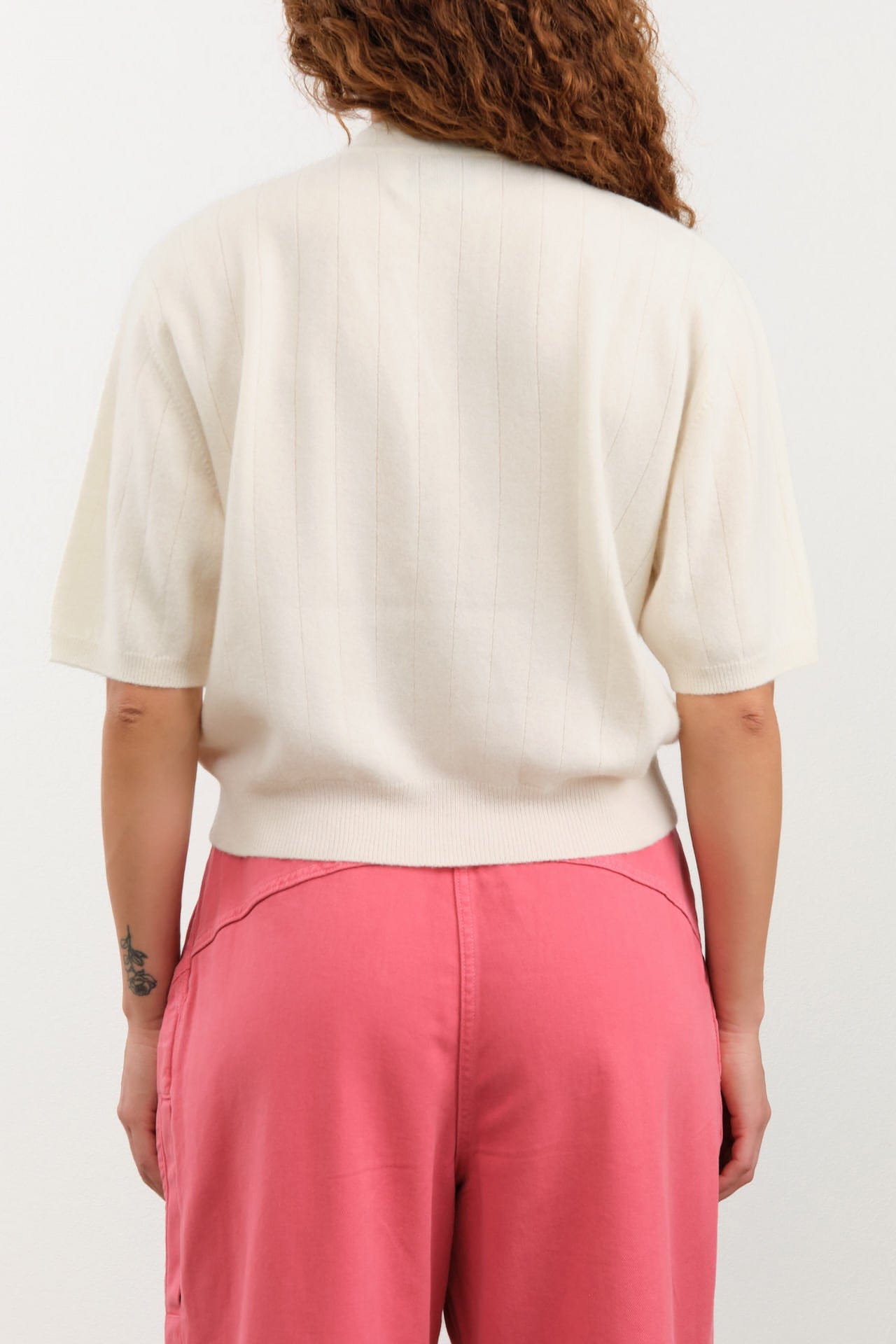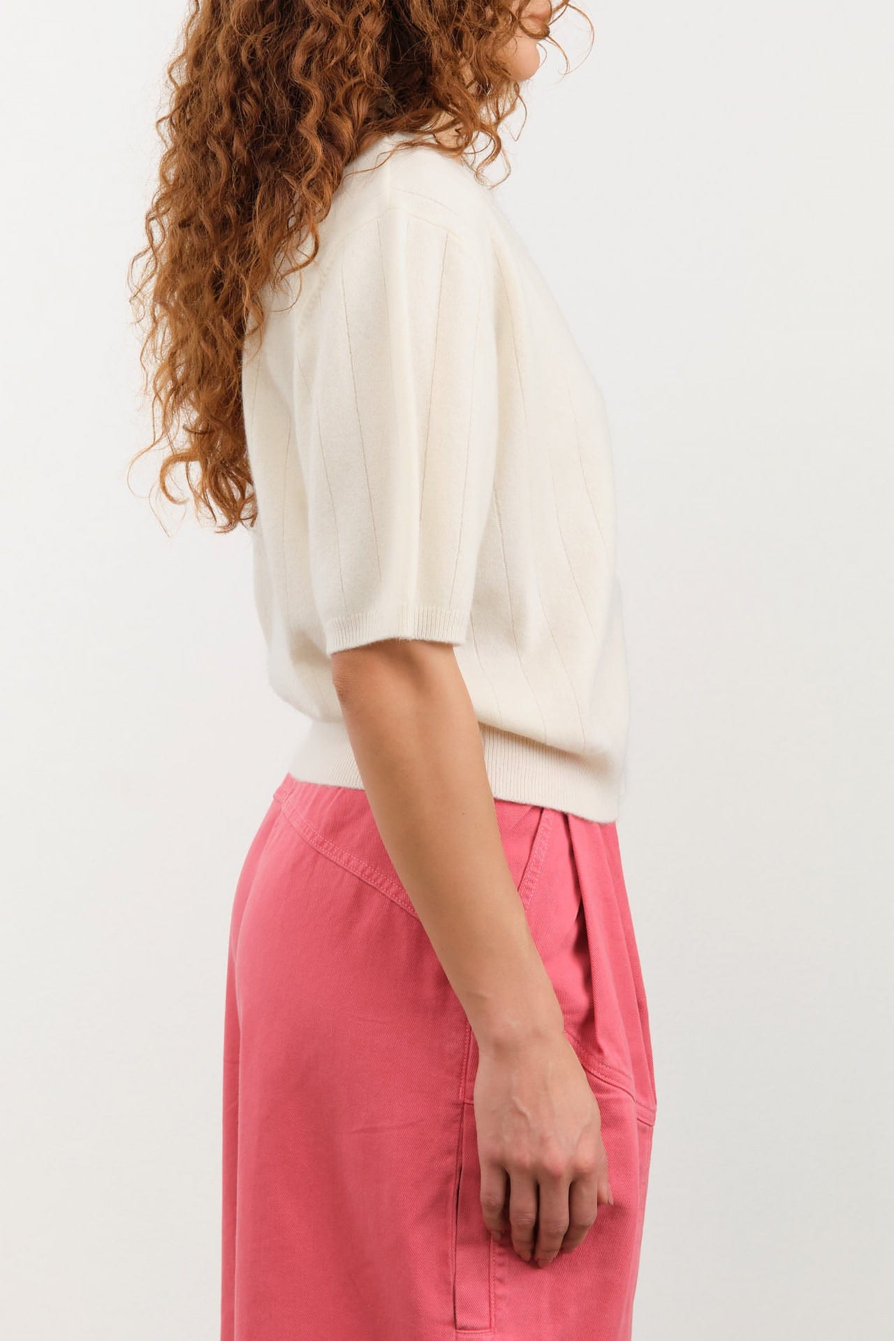 The Joan Cashmere Cardigan is a relaxed V-neck cardigan that features half-length sleeves and charming petite grey shell buttons, complemented by tidy rib trims for a polished look. The unique drop-needle texture adds to the subtle wide ribs, enhancing its sophisticated appeal. Ideal for layering or wearing on its own, this cardigan is a versatile addition to any wardrobe, ensuring you stay cozy and chic in any setting.