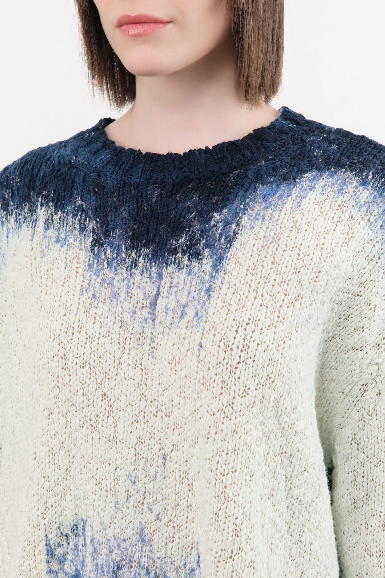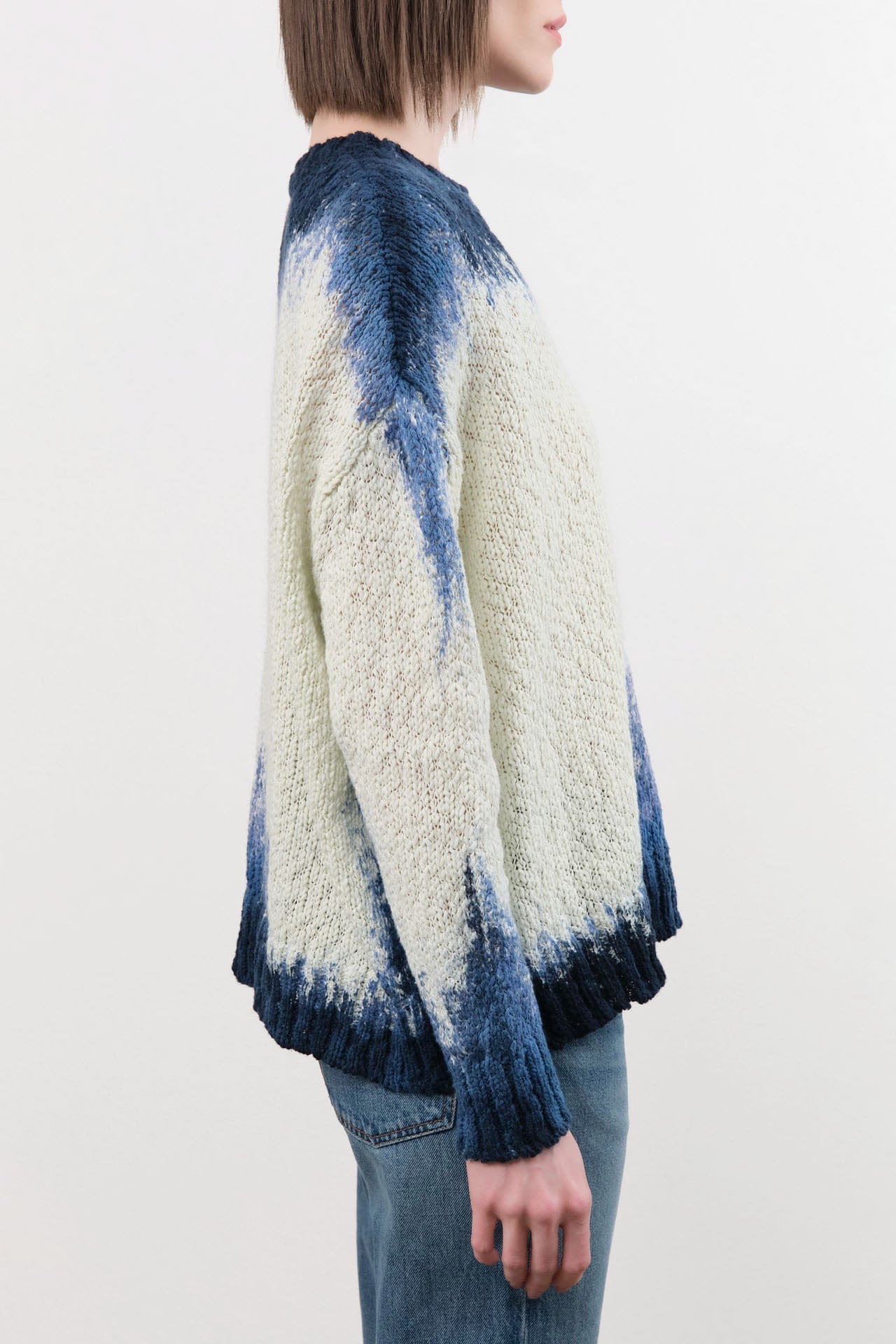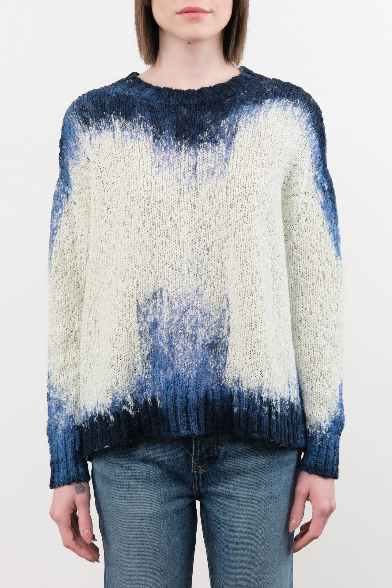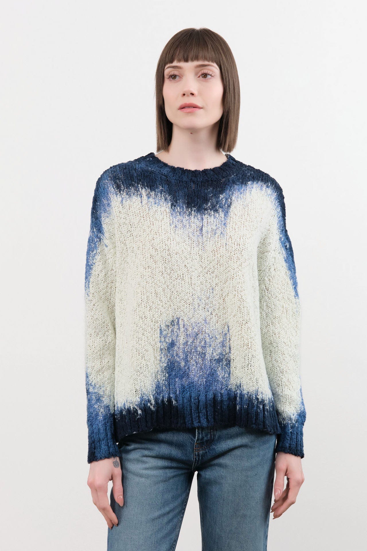 The Grace Cotton Crew Sweater, made from thick cotton, features a chunky stitch and a stunning blue dye pattern along the edges. The ribbed neckline, cuffs, and bottom hem provide a snug fit, while the wide crewneck and drop shoulder design ensure a relaxed silhouette. Elevate your casual look with this versatile sweater that promises warmth and sophistication for any occasion.