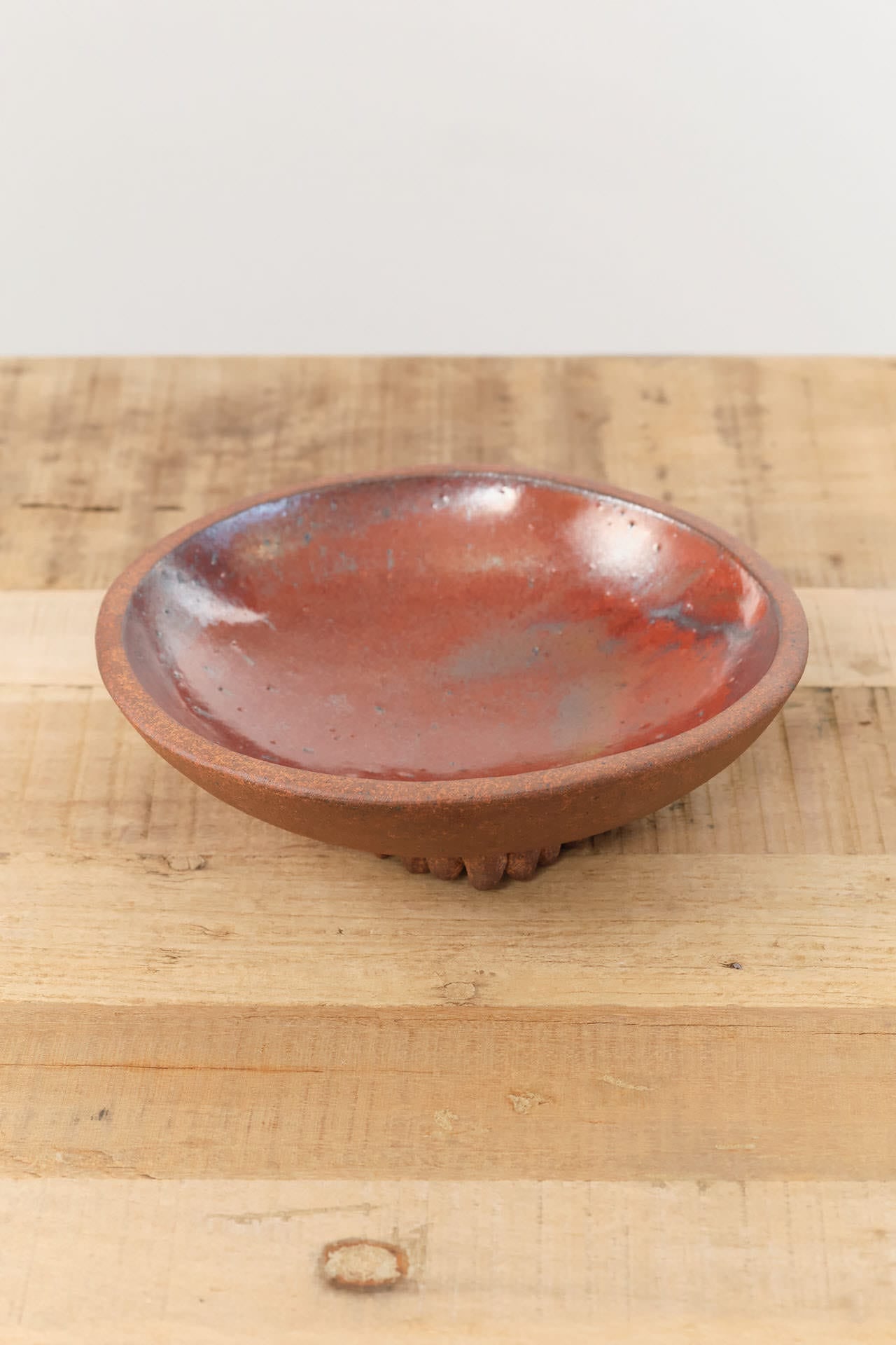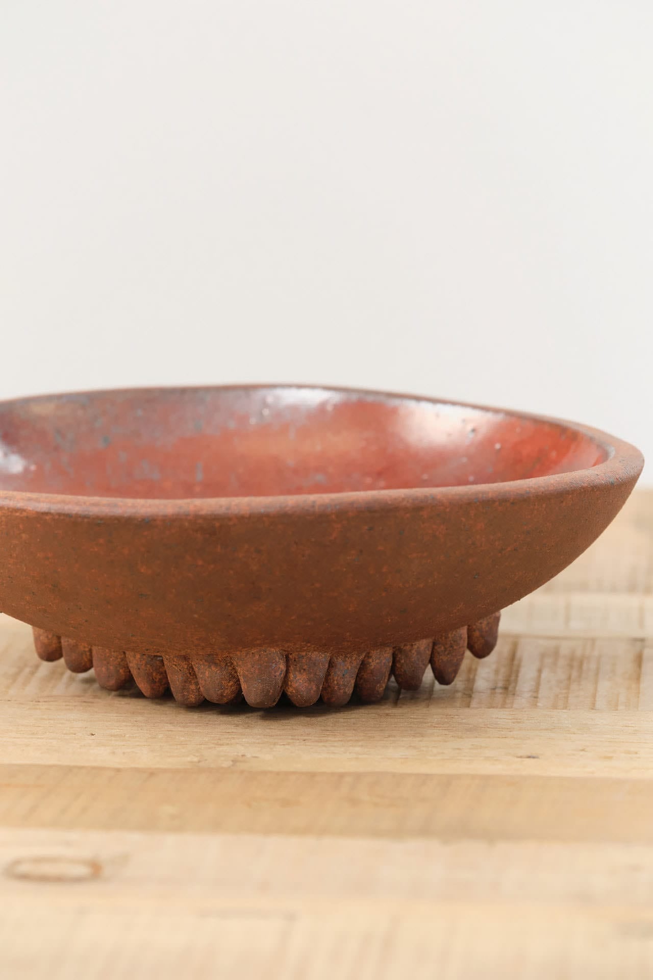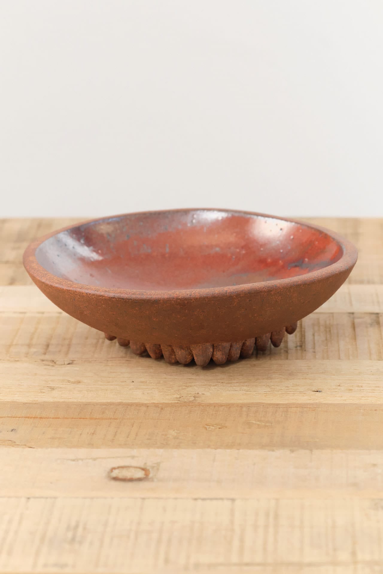 The Large Bowl 026 is a stunning blend of brown stoneware and a metallic red glaze. Its sanded exterior and glazed interior enhance its aesthetic appeal and ensure durability and function. The striking glaze alongside the unique bottom details make this bowl a perfect centerpiece for any table setting. A must-have addition to your kitchenware collection.