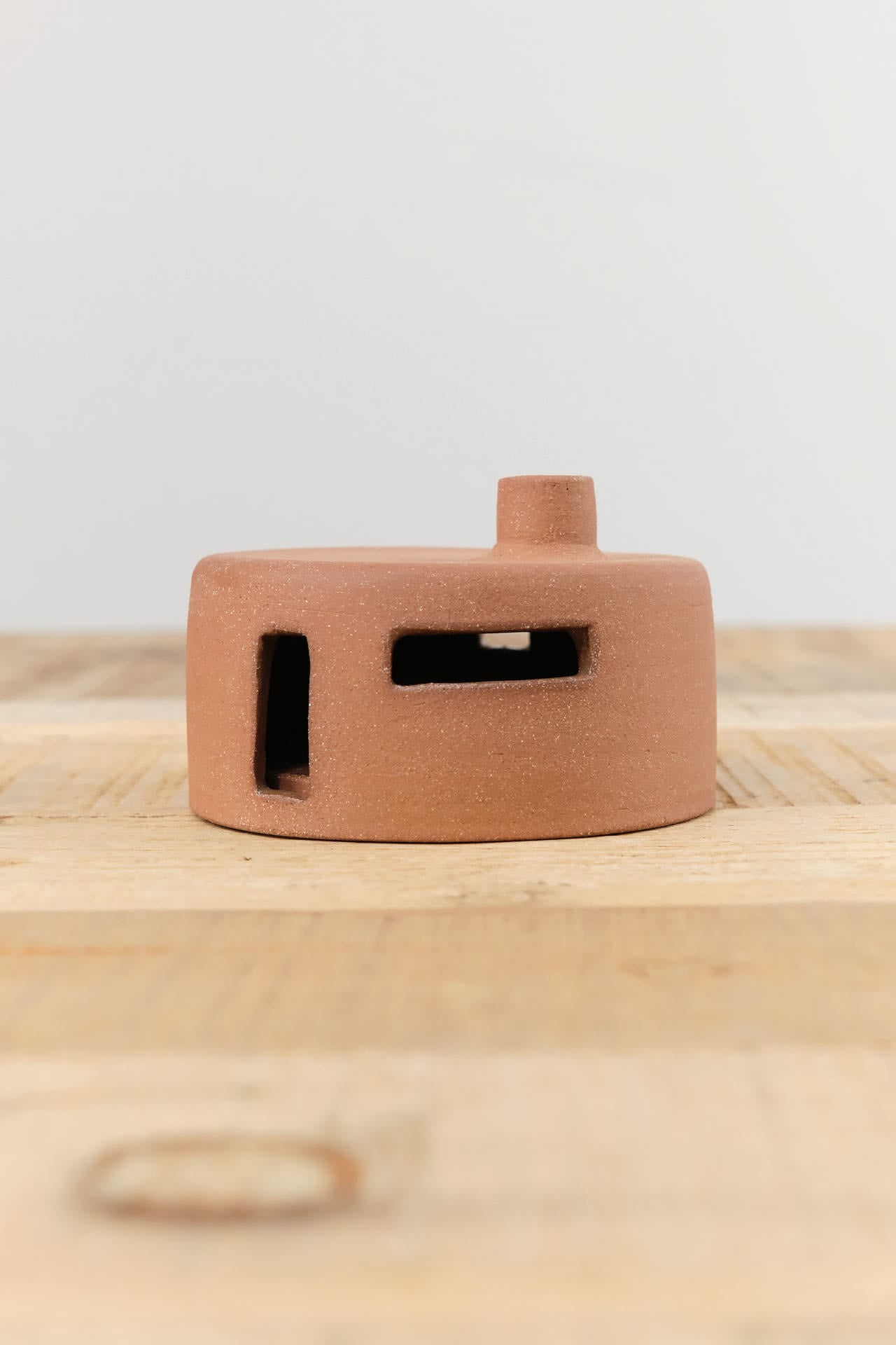 This incense holder is the perfect replica of an adobe-style house. The flame-resistant base plate is designed to hold the incense, while a glazed surface shields the stoneware from heat. Witness the aromatic smoke curling out of the tiny earthenware dwelling's chimney.
