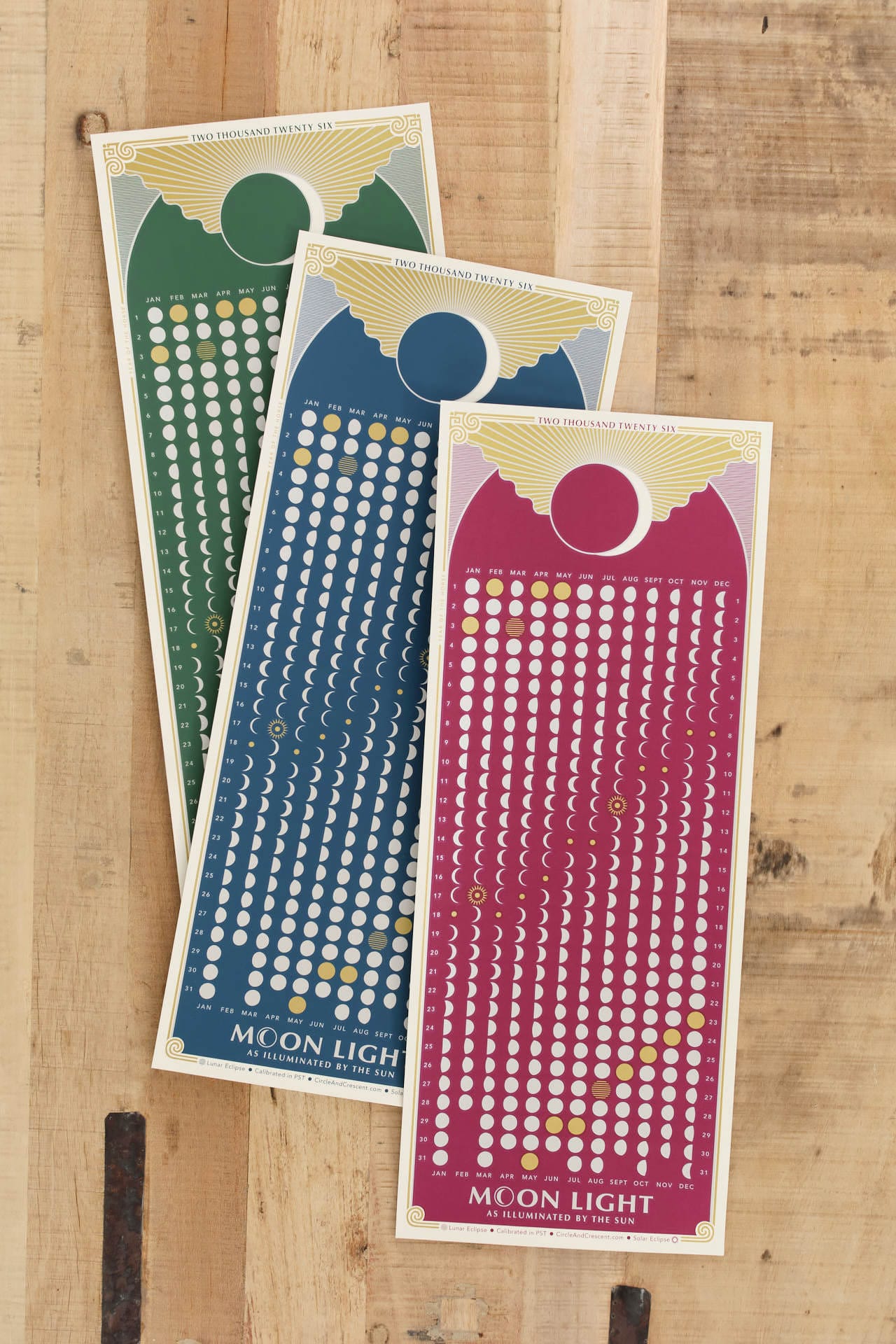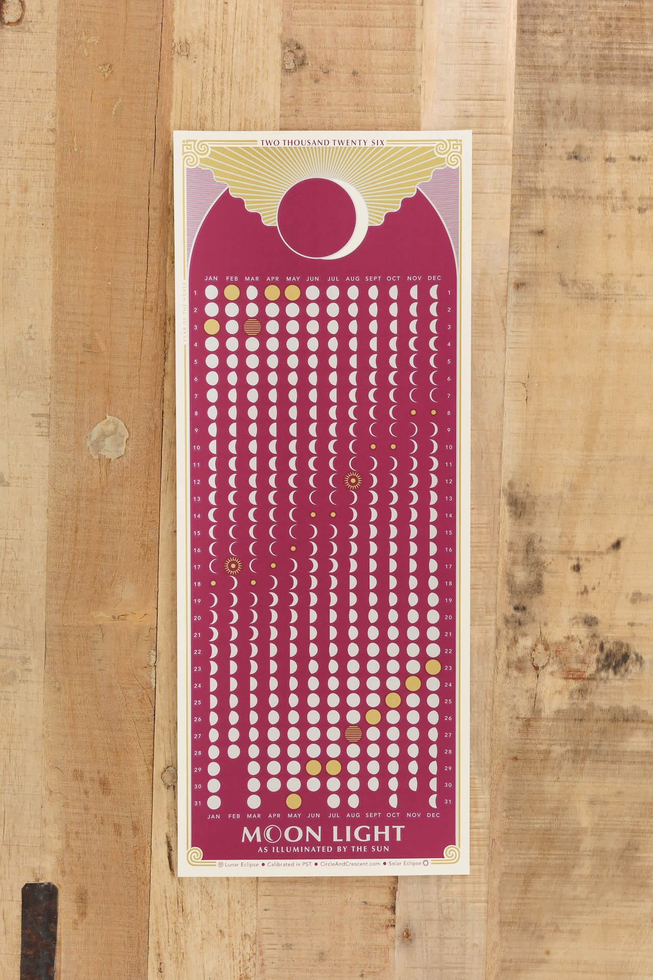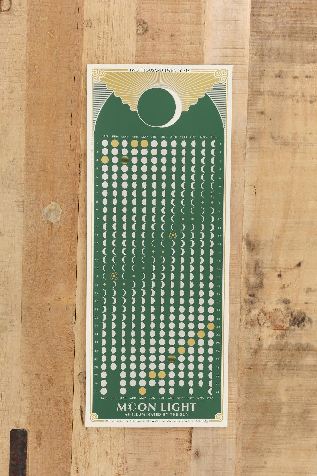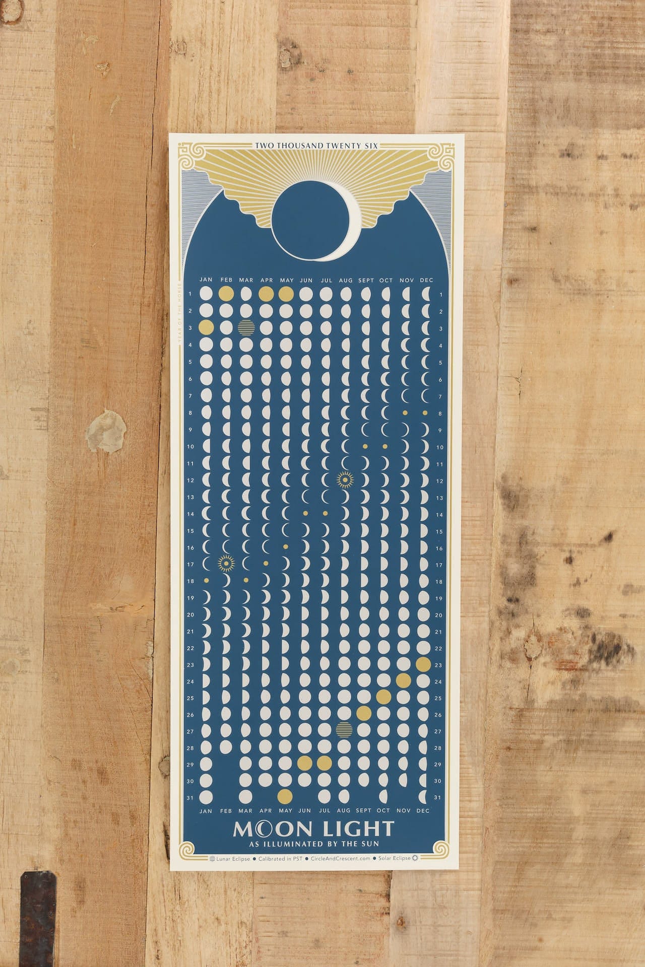The 2026 Moon Prints feature a hand-screened design, made in California. This charming and minimalistic artwork highlights the new full moons and significant celestial events, all calibrated to Pacific Standard Time. Perfect for astronomy enthusiasts and those who appreciate refined decor, this print serves as both a functional calendar and a stunning visual piece.