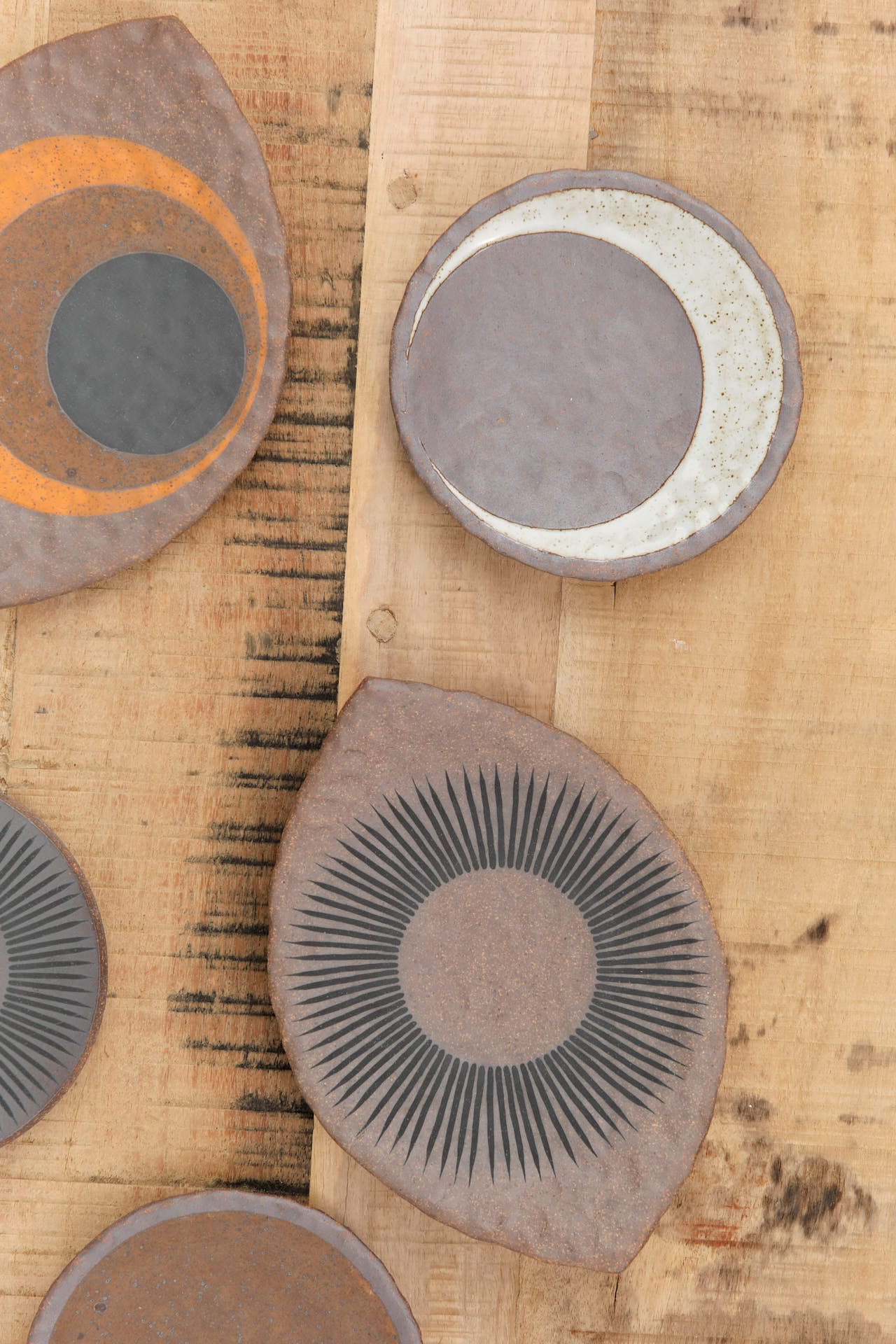 The Hammered Round Dish in Tucker Crescent by MQuan is a hand-formed, hammered Tucker stoneware dish featuring a moon design on top and the MQuan crescent and stamp on the bottom. With a hammered texture made from natural material, this dish has a rustic and unique appearance that is a great addition to any living space.