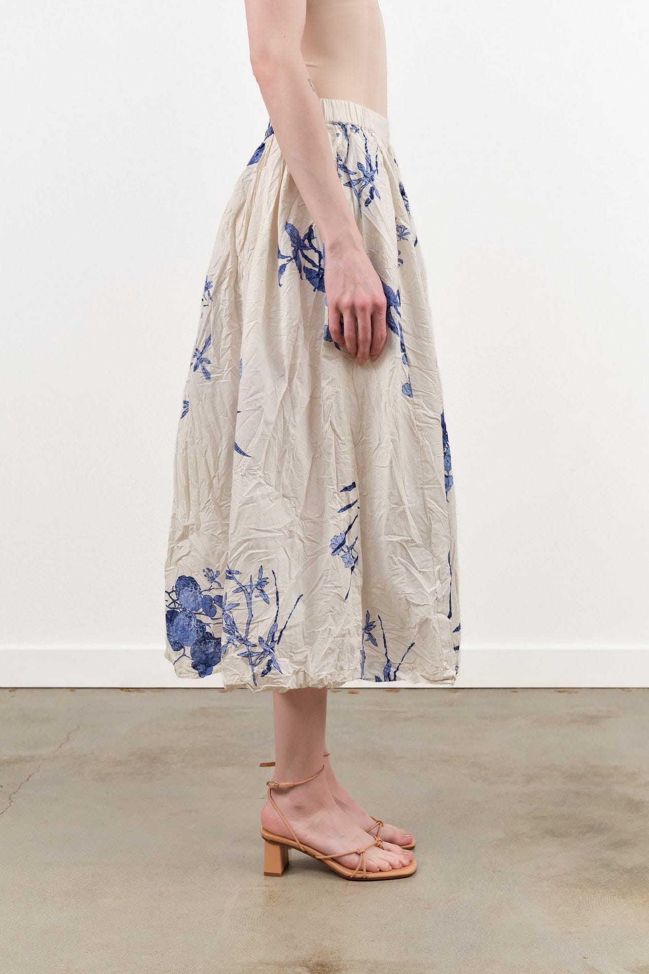 The Japonism Flower Print Skirt is a stunning midi skirt made from soft, lightweight cotton. Adorned with a delicate blue floral print against a chic ivory backdrop, this skirt features a unique crinkled texture that adds depth and character. The elasticated waistband ensures a comfortable fit, while the convenient side pockets provide practicality without sacrificing style. Perfect for any occasion, this skirt is perfect for transitional seasons.