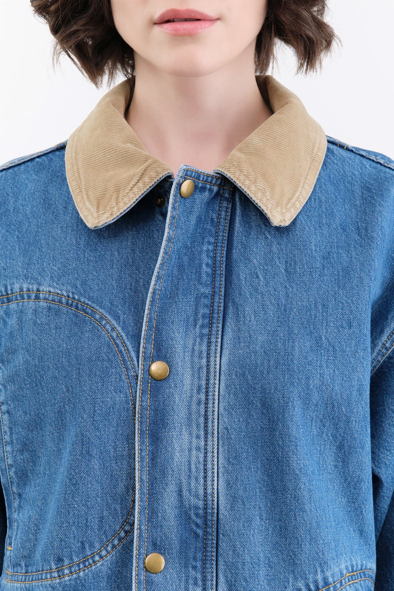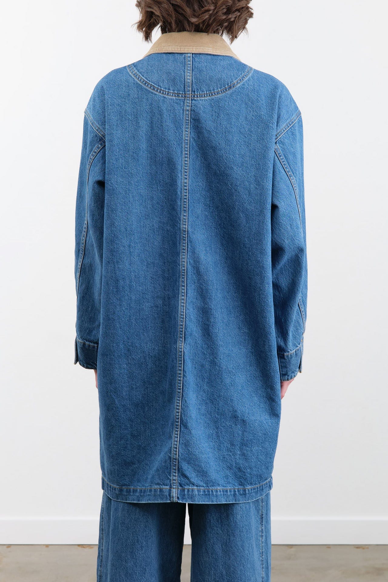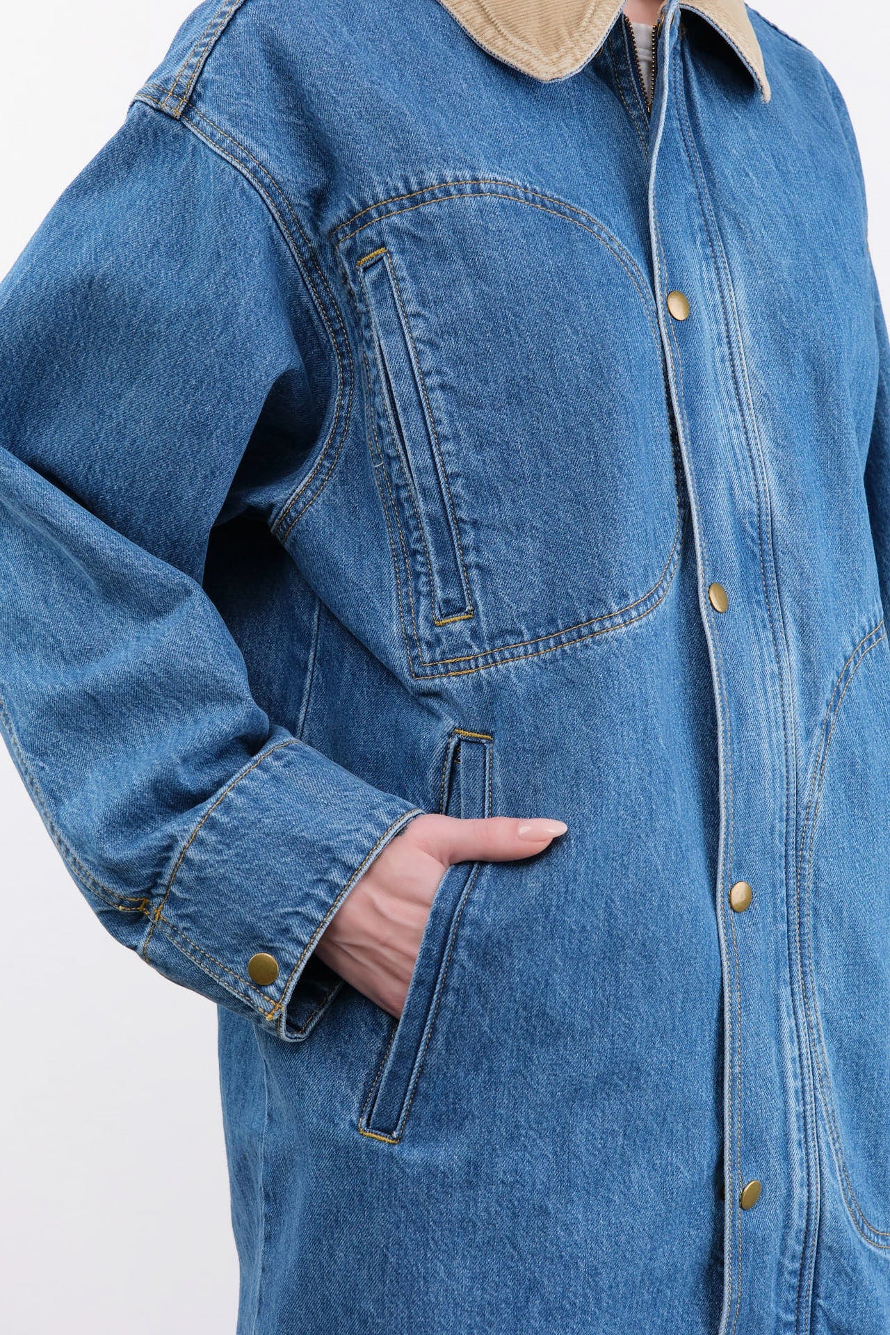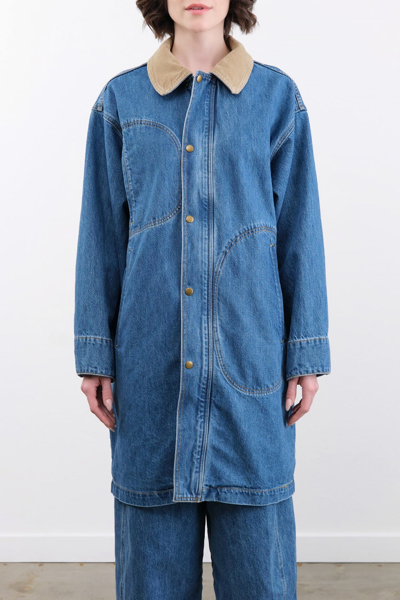 The Town and Country Coat is made from premium Italian Denim. This long duster utility coat features thoughtfully designed chest and waist pockets, a secure zipper and snap closure, and a contrasting corduroy collar for a touch of sophistication. Its roomy fit allows for effortless layering over your favorite knits, making it an ideal choice for any season.