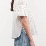The Jenn Top is a stunning blend of femininity and elegance. Featuring a wide, ruffled, elasticated neckline and delicate ruffled detailing along the chest, this top offers a flattering fit that enhances your silhouette. Perfect for warm summer days, the Jenn Top effortlessly combines modern style and everyday comfort.