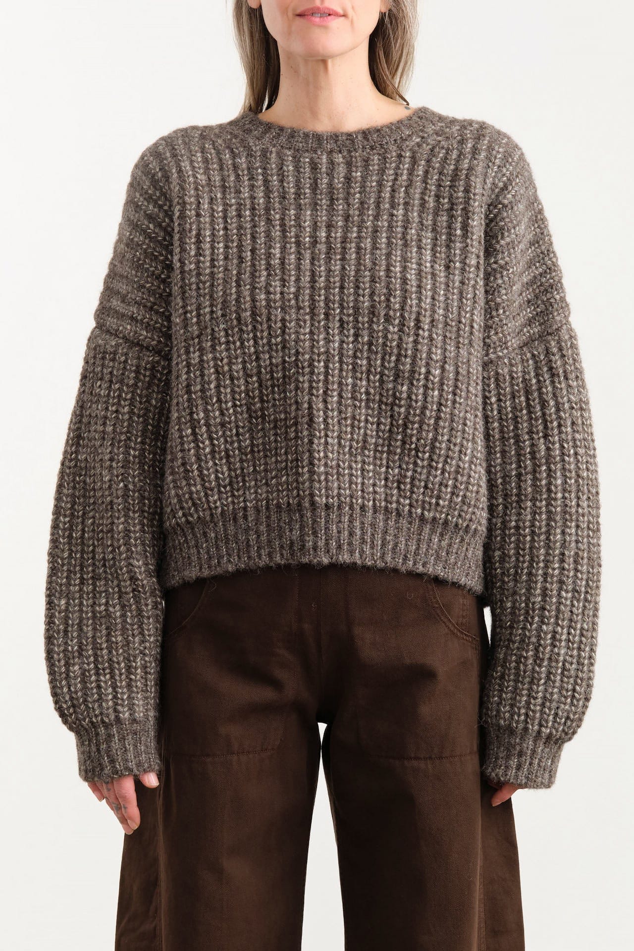 The Classic Crewneck Sweater is made from a luxuriously soft and warm wool-blend, with a light heathered warm gray hue. This signature chunky knit design offers a cozy, cropped, and boxy silhouette, making it an ideal layering piece or a stylish standalone option. Its timeless appeal ensures it will remain a wardrobe staple season after season.