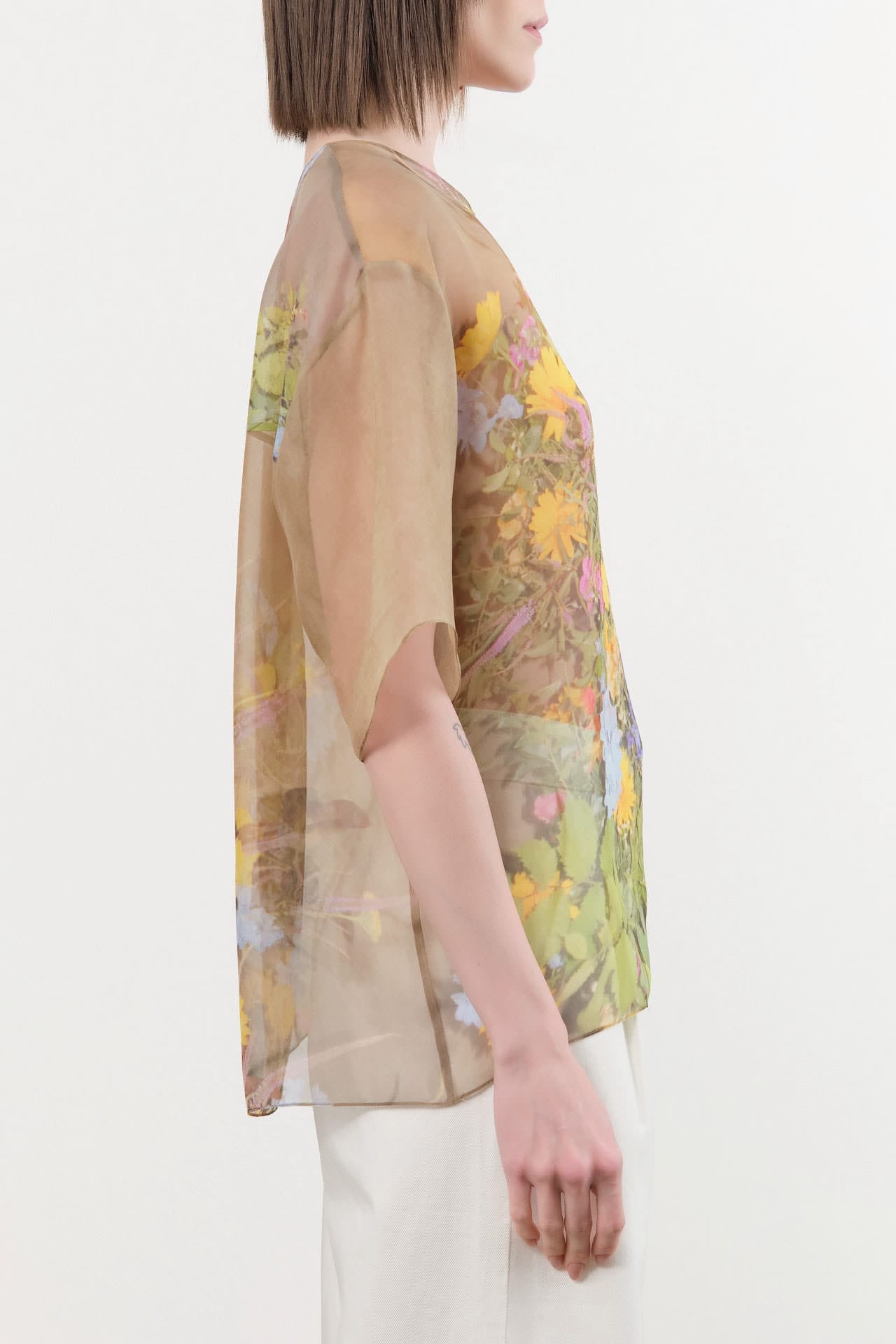 The Chiffon T-Shirt is a stunning, lightweight linen top designed for effortless wear for the upcoming summer days. Featuring a charming floral print throughout, this top features wide half sleeves and a flattering wide crewneck for a feminine silhouette. The drop shoulder design adds a relaxed touch, while the convenient hanging loop on the back ensures easy storage.