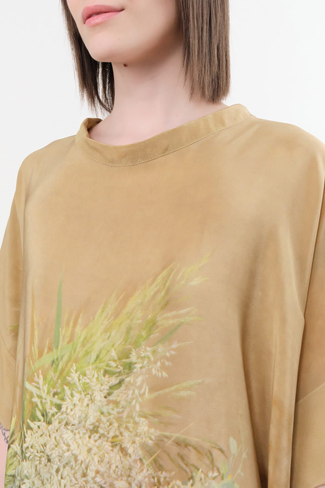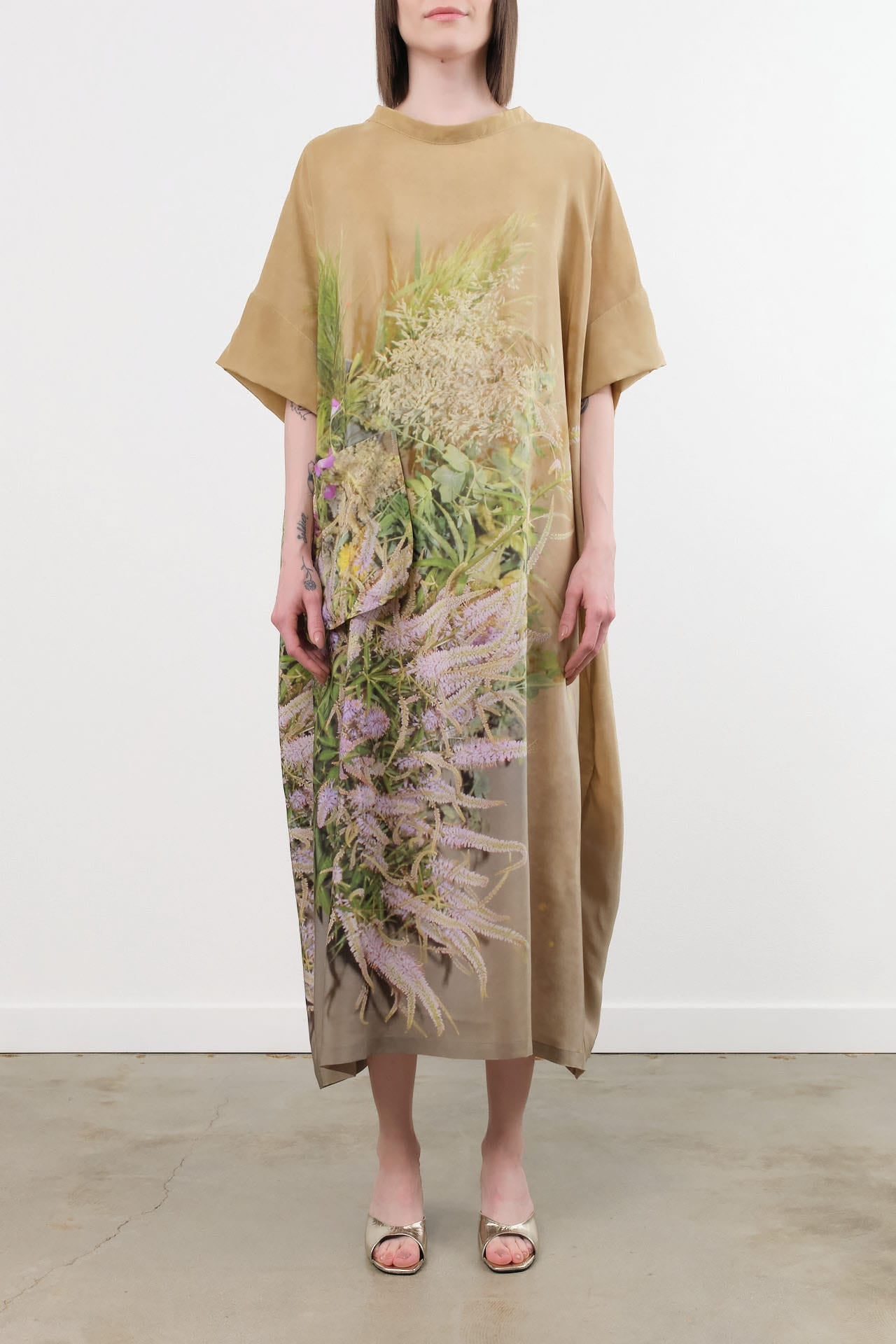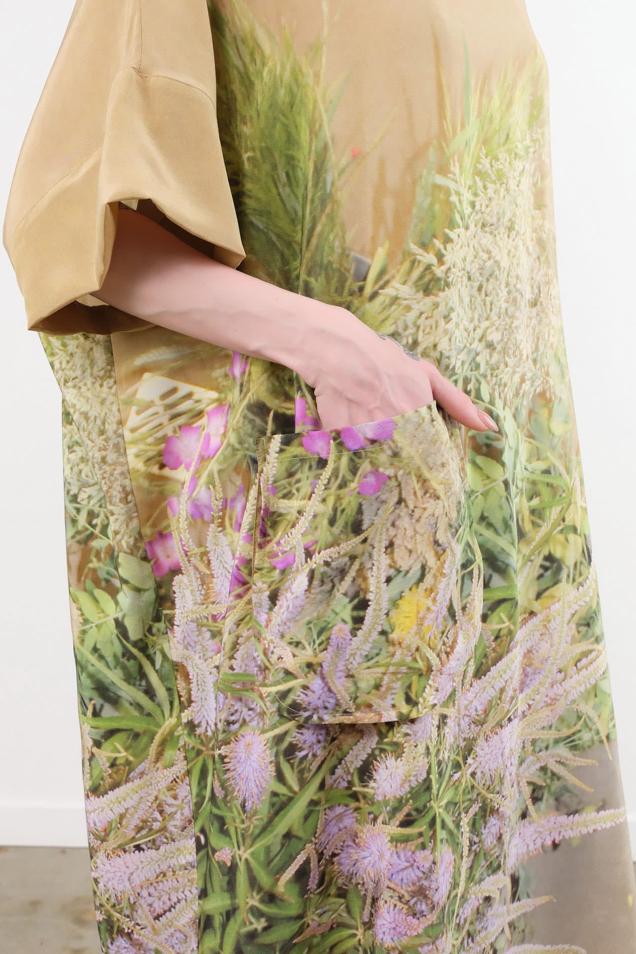 The Silk Dress in Print B is beautiful and elegant, made from 100% organic silk for an exceptionally soft and smooth finish. This flowy dress features an oversized, relaxed fit, ensuring comfort while exuding feminine grace. Adorned with a stunning floral and foliage print against a classic tan background, it is the perfect choice for any occasion, combining modern style and timeless taste effortlessly.