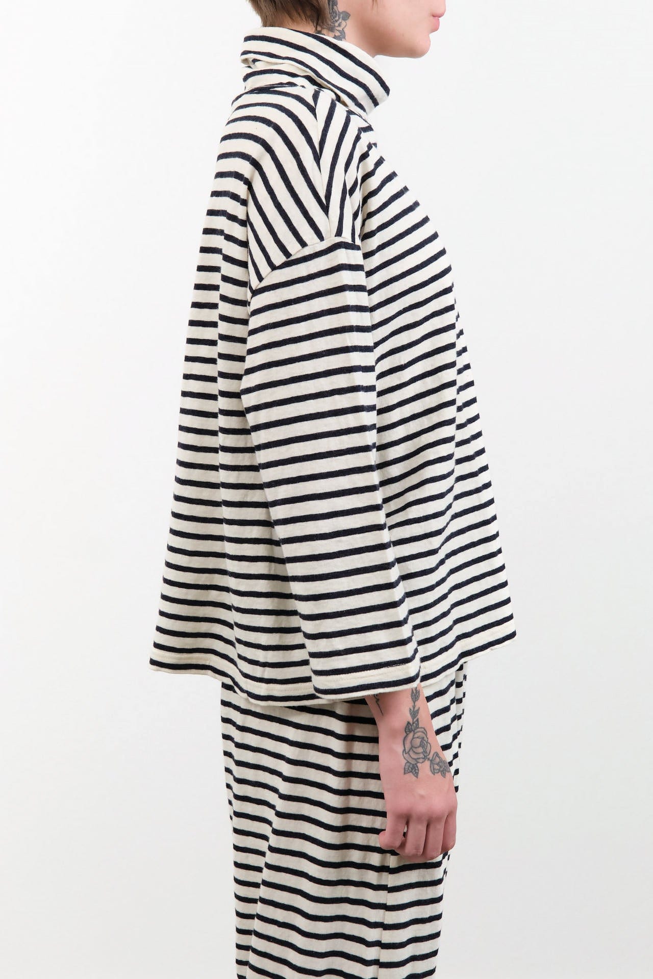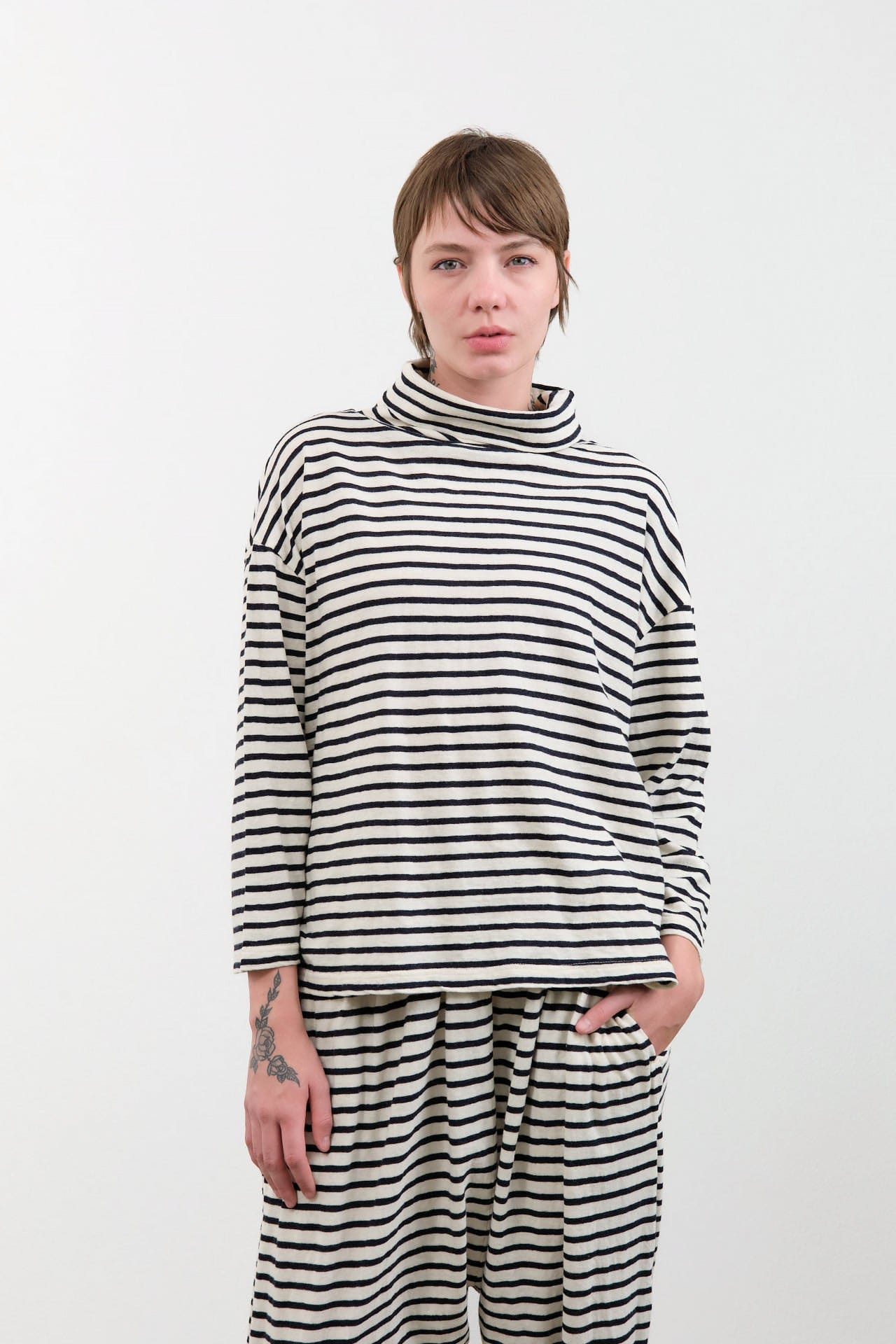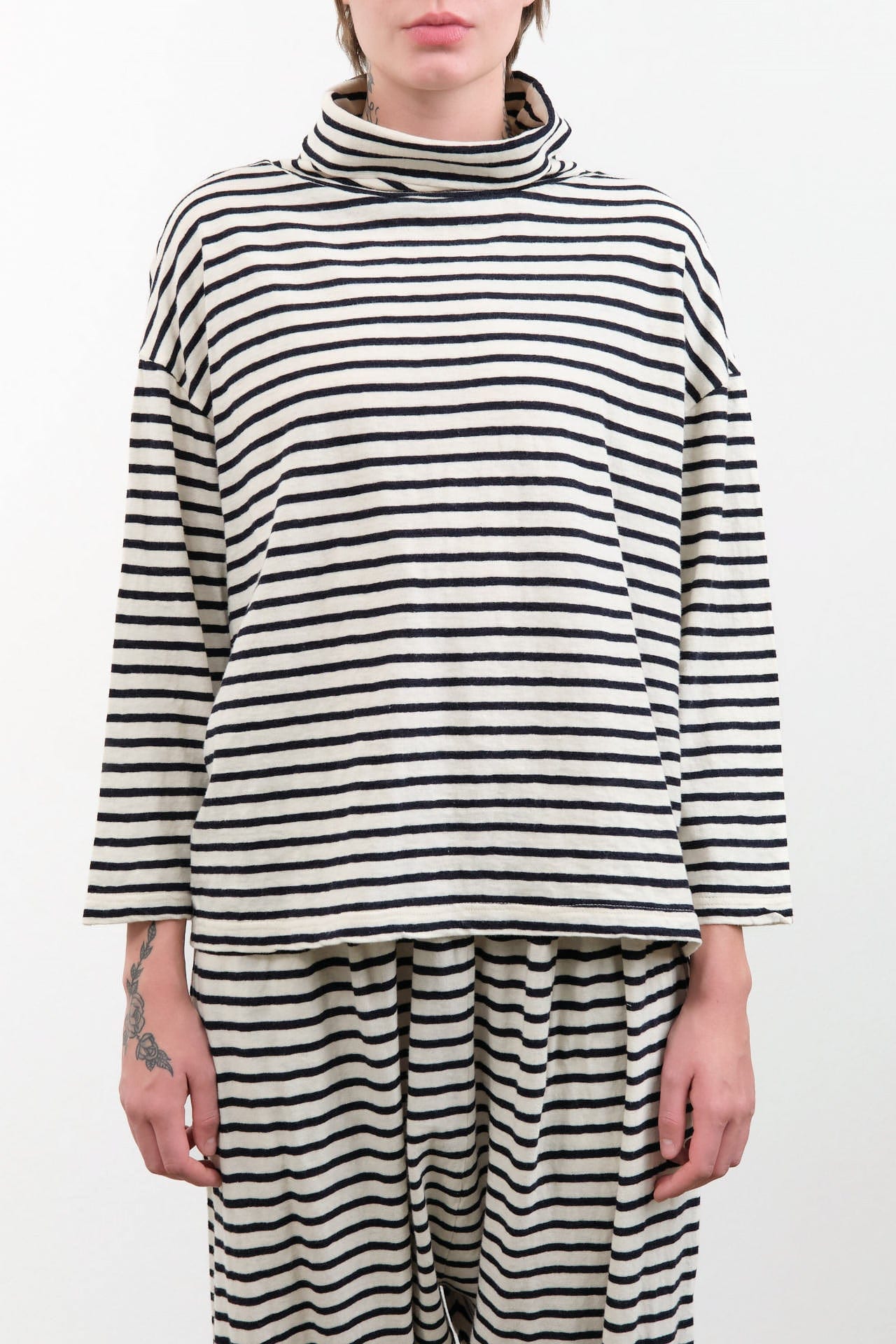 The Stripe Knit Turtle Neck is thoughtfully made from soft cotton, features a slight drop shoulder design, a cozy turtleneck, and long sleeves, making it perfect for layering or solo wear.
