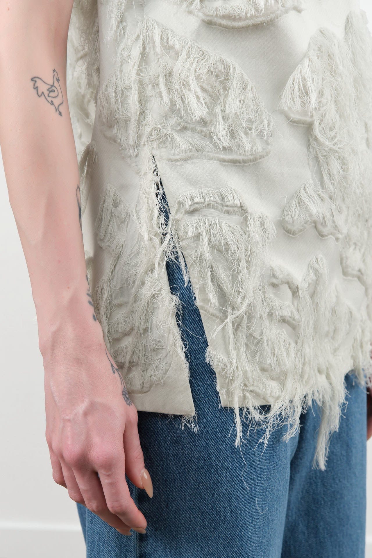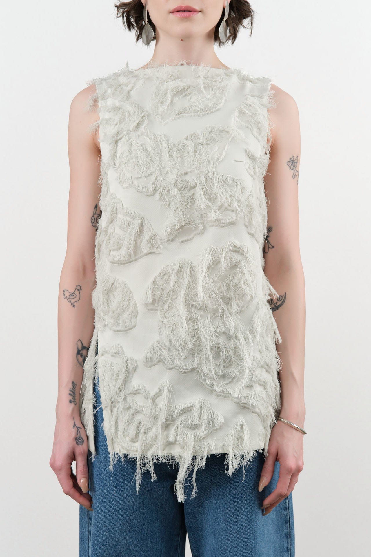 The Mager Top is a pullover top that features a chic boatneck design and asymmetrical side slits, adding a modern twist to your look. The fringe detail and rear keyhole with button closure enhance its unique appeal, while the darted bust ensures a flattering fit. Perfect for any occasion, the sleeveless design makes it an ideal choice for layering or wearing solo.