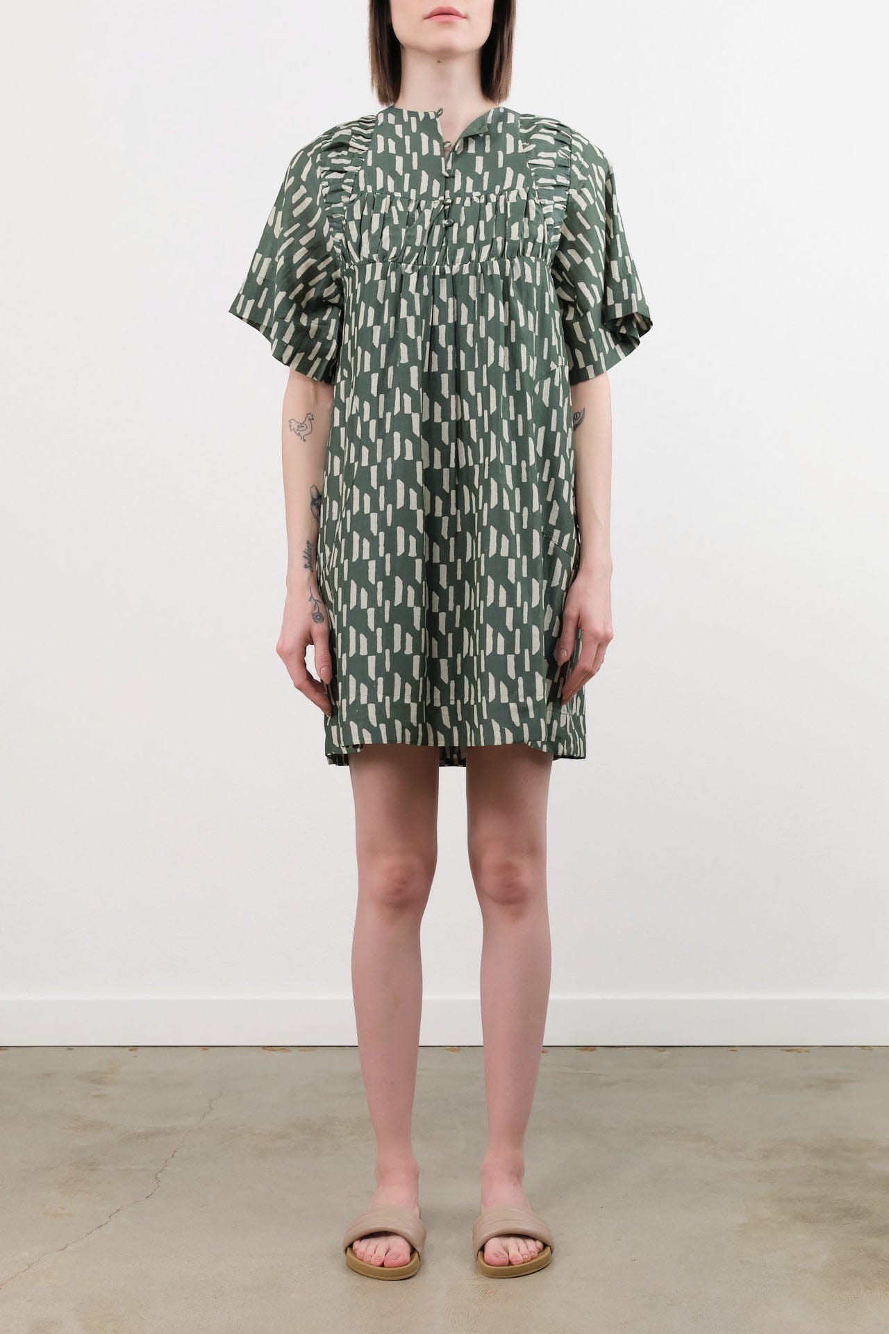 The Marrakesh Dress is a boxy silhouetted short length dress, featuring oversized sleeves that reach the elbows. This dress flaunts a front button up, side pockets, and a beautifully detailed ruched pleat on the front and back. The elegant and relaxed look is completed with a cinched ruffle detail along the outer sides of the sleeves.