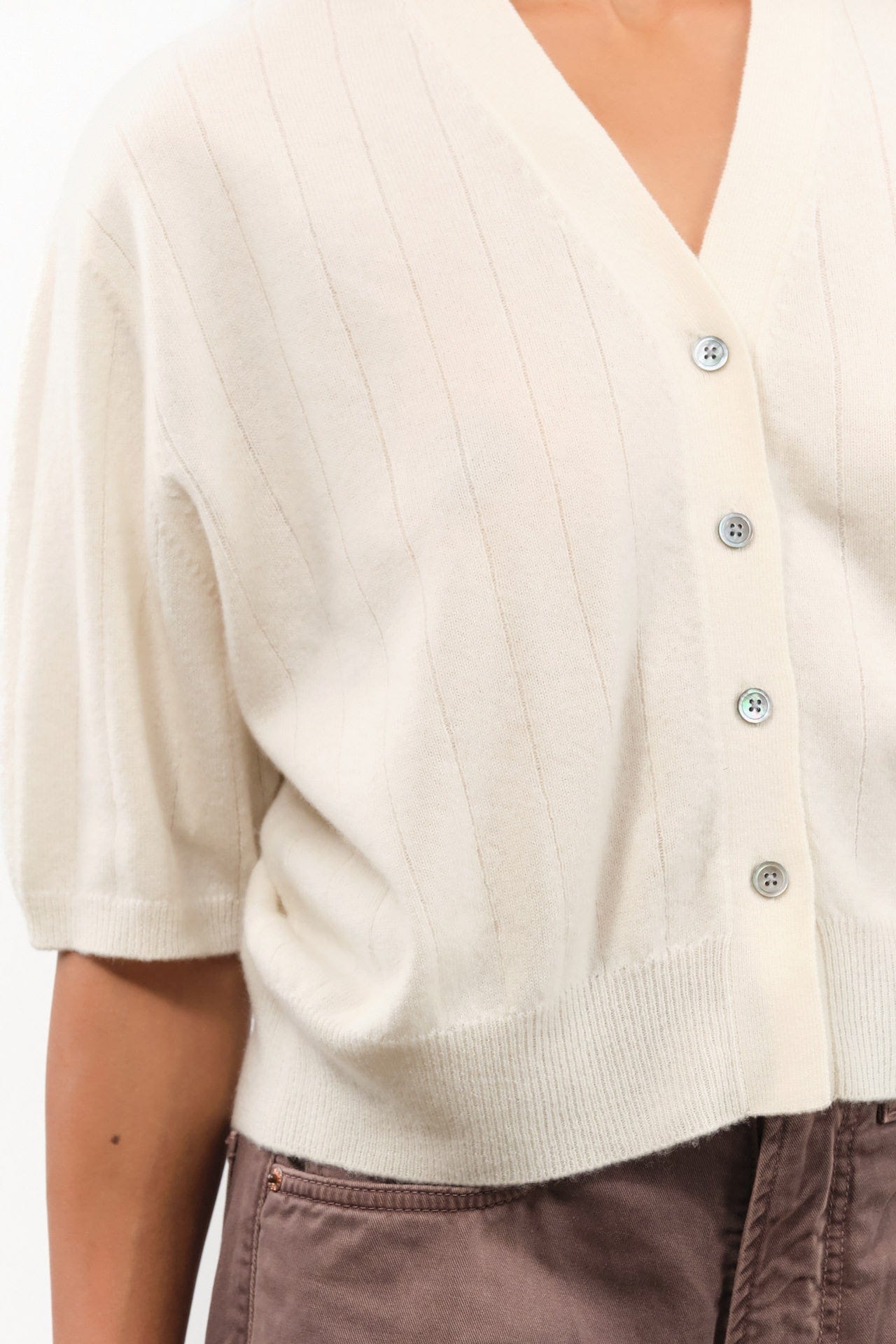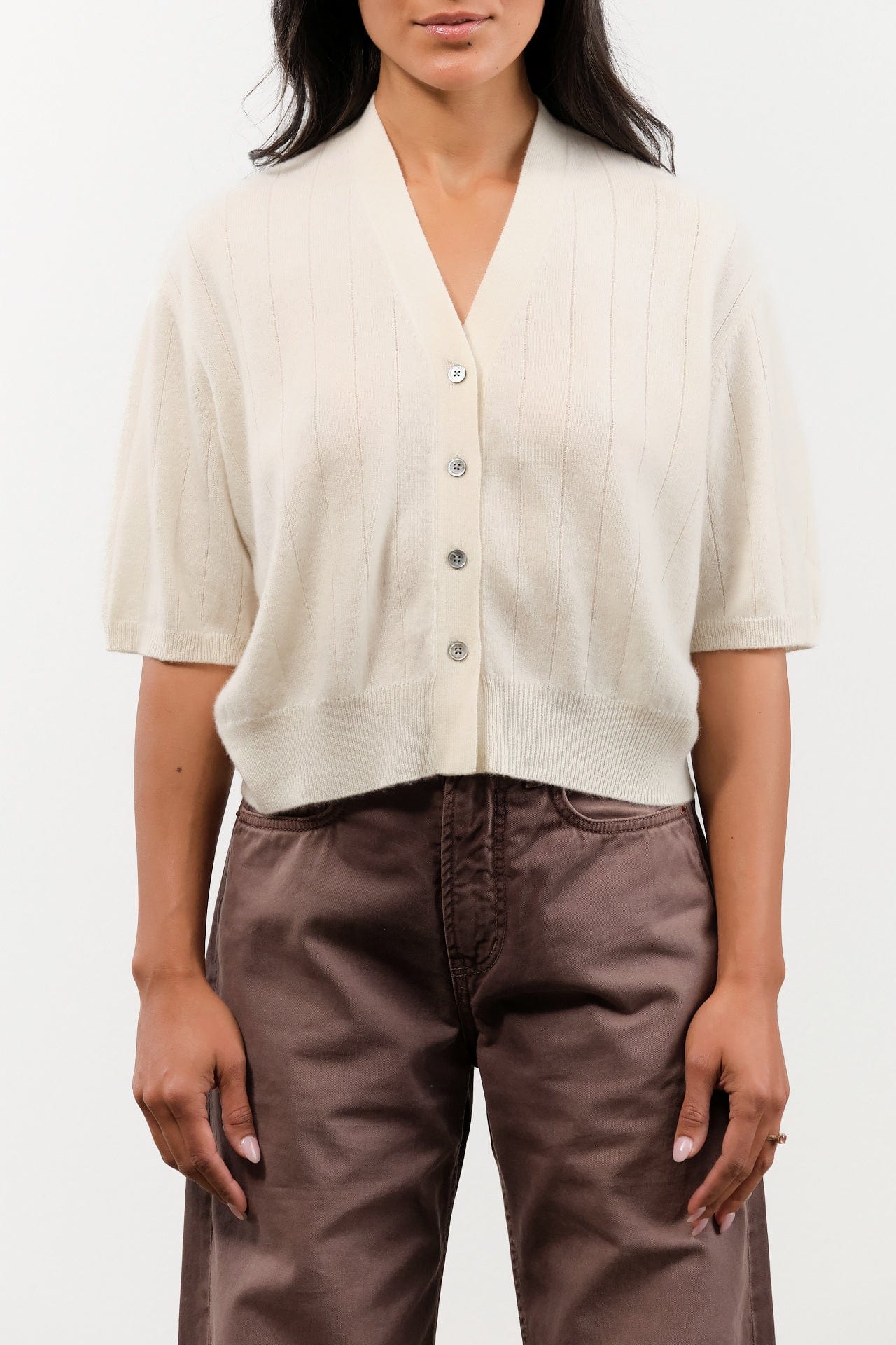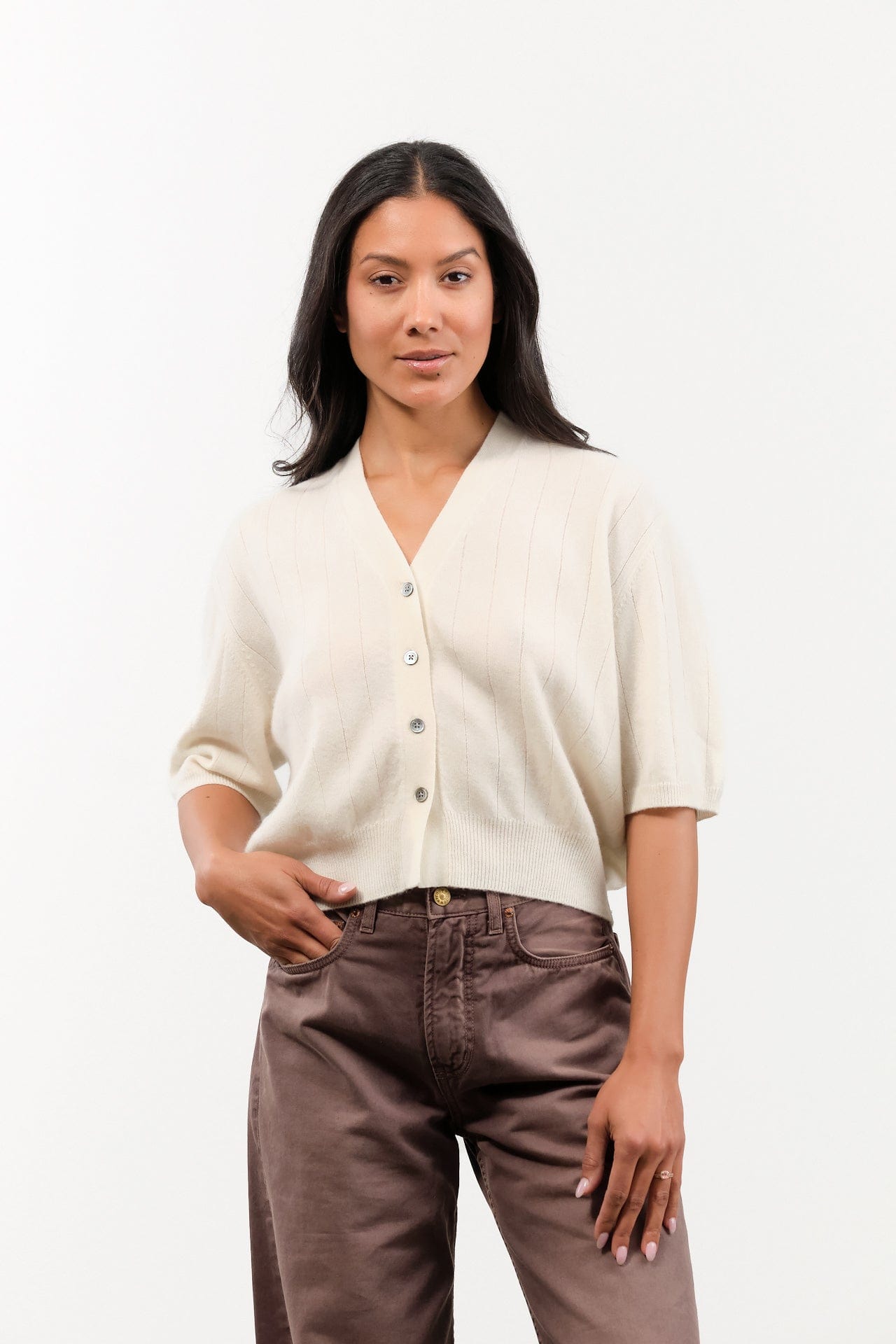 The Joan Cashmere Cardigan is a relaxed V-neck cardigan that features half-length sleeves and charming petite grey shell buttons, complemented by tidy rib trims for a polished look. The unique drop-needle texture adds subtle wide ribs, enhancing its sophisticated appeal. Ideal for layering or wearing on its own, this cardigan is a versatile addition to any wardrobe, ensuring you stay cozy and chic in any setting.