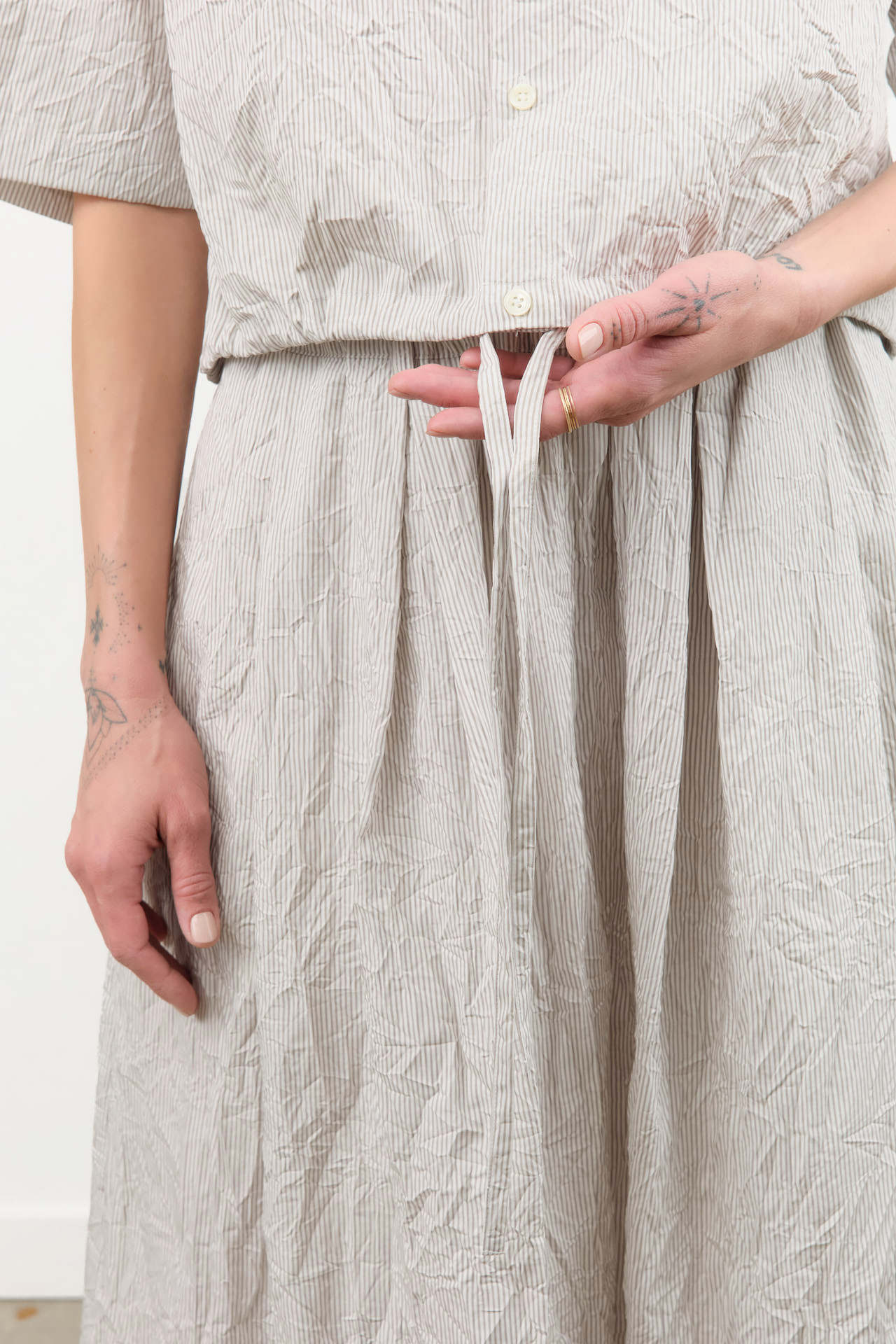 The Linda Top is a chic cotton blouse designed for modern elegance. Featuring a unique crinkled texture throughout, this top has a contemporary, cropped, boxy fit. The cinching tie at the waist allows for versatile styling options, while the foldover collar and button-up front add a touch of timeless sophistication. Complete with a single chest pocket, the Linda Top effortlessly transitions from day to night.