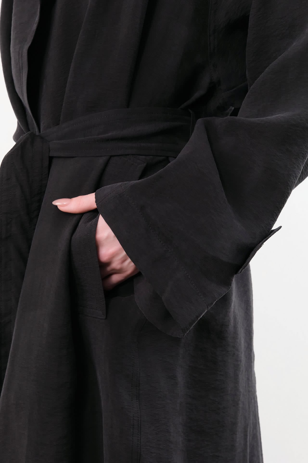 The Jada Jacket is a long trench made from lightweight, wrinkle-resistant Poppy cupro fabric that has a crisp hand feel and soft pebble texture, making it ideal for travel. This stylish piece features a wide notched collar, set-in sleeves with button-tab cuffs, and convenient welt side pockets, all designed with an airy, unlined construction for a breezy, comfortable fit. The relaxed silhouette is beautifully complemented by a self-tie belt at the waist and a storm flap detail at the back, ensuring ease of movement.