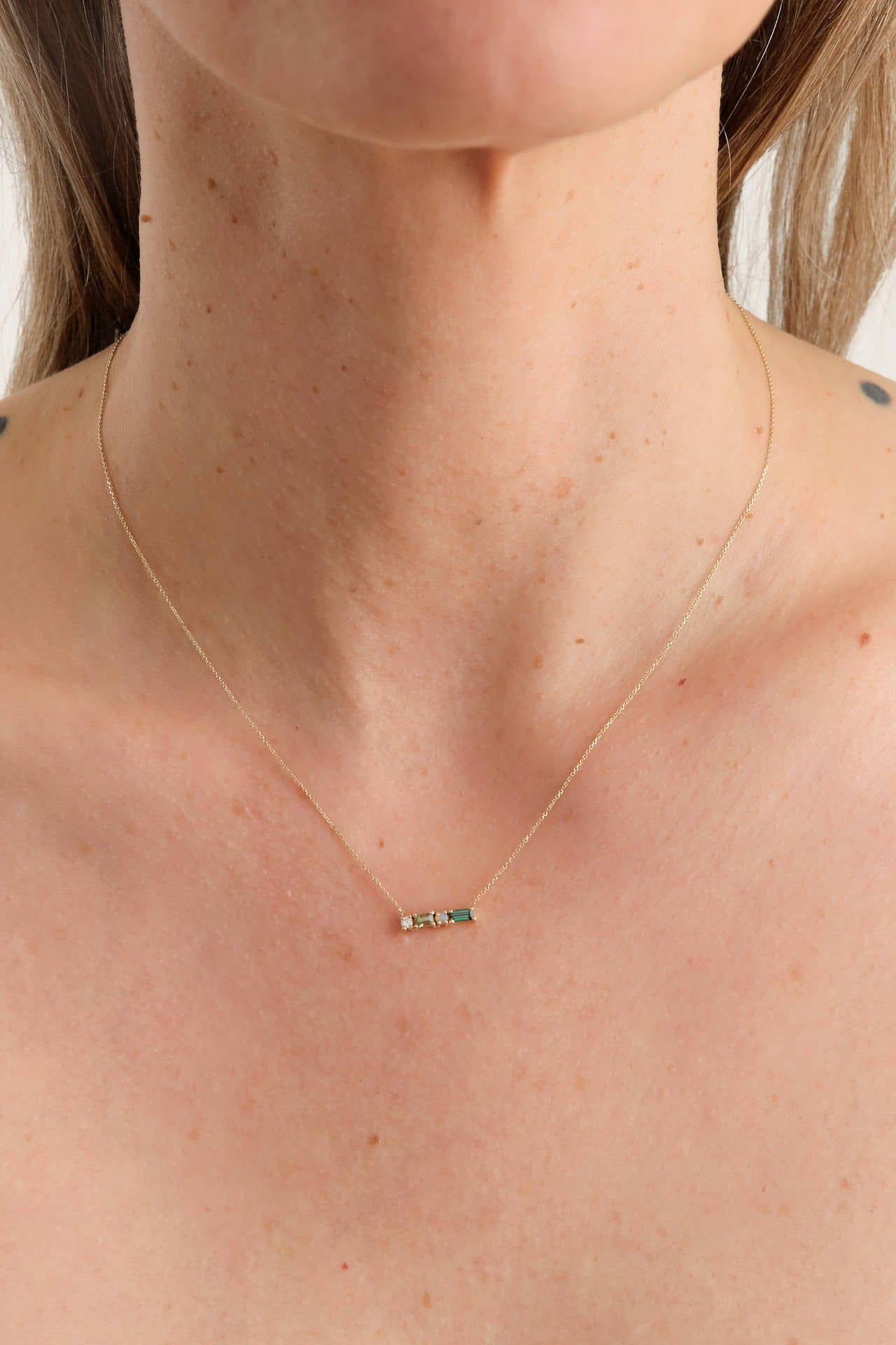 The Pillar Necklace by WWAKE adds a touch of elegance and strength to any outfit. Made from 14K Yellow Gold, it features a unique Brickwork design with reclaimed white diamond, Australian Opal, and Vintage Rough Green Tourmalines from Afghanistan. With a comfortable 16" chain, this necklace is the perfect layering or stand alone addition to your jewelry collection.