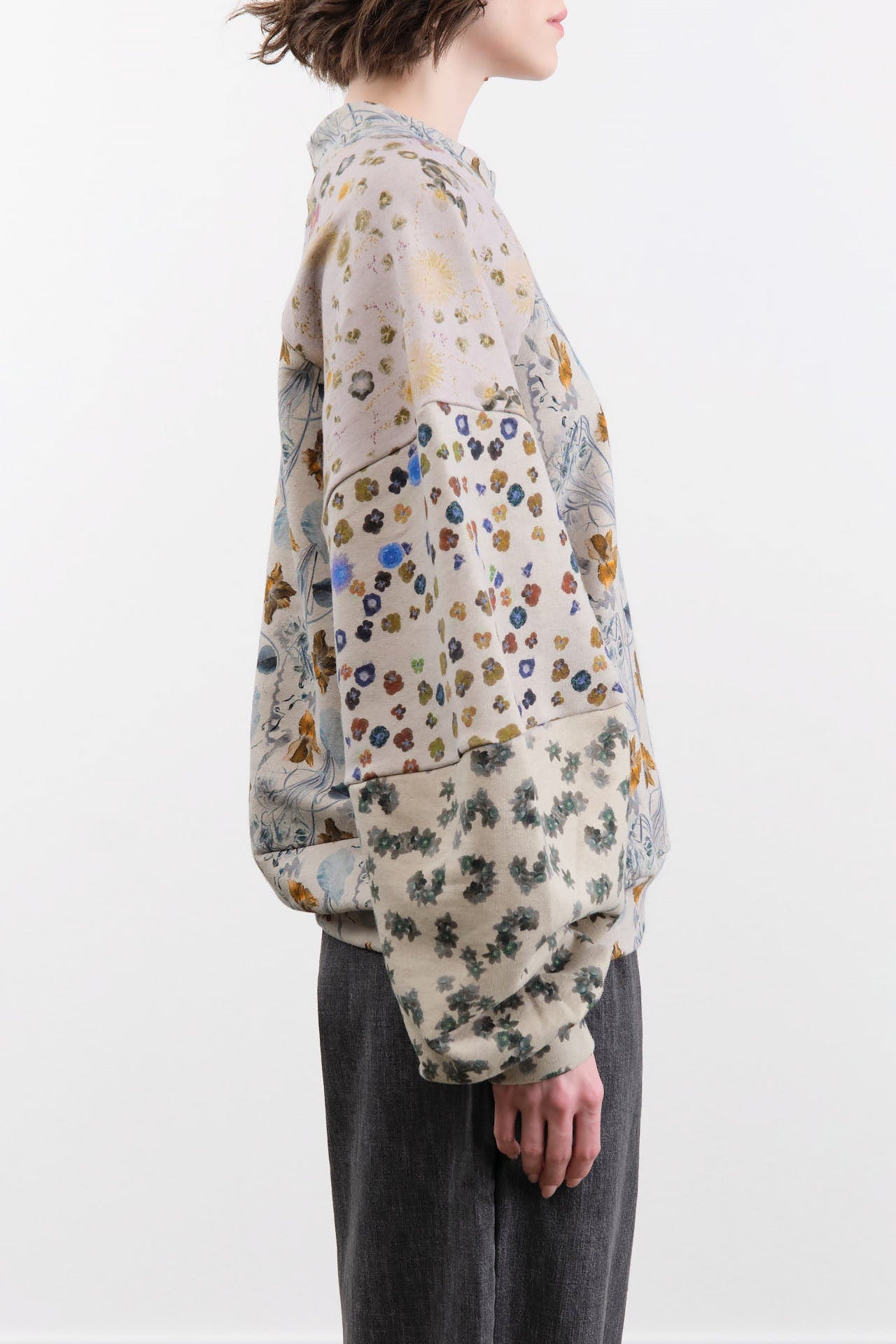 The Cotton Hemp Pullover, made from a luxurious cotton and hemp blend, is an oversized pullover featuring raglan sleeves and a relaxed drop shoulder design for effortless wear. The classic crewneck is complemented by ribbed trims for a snug and classic fit. Adorned with a charming floral pattern throughout, this pullover combines everyday comfort with timeless elegance.