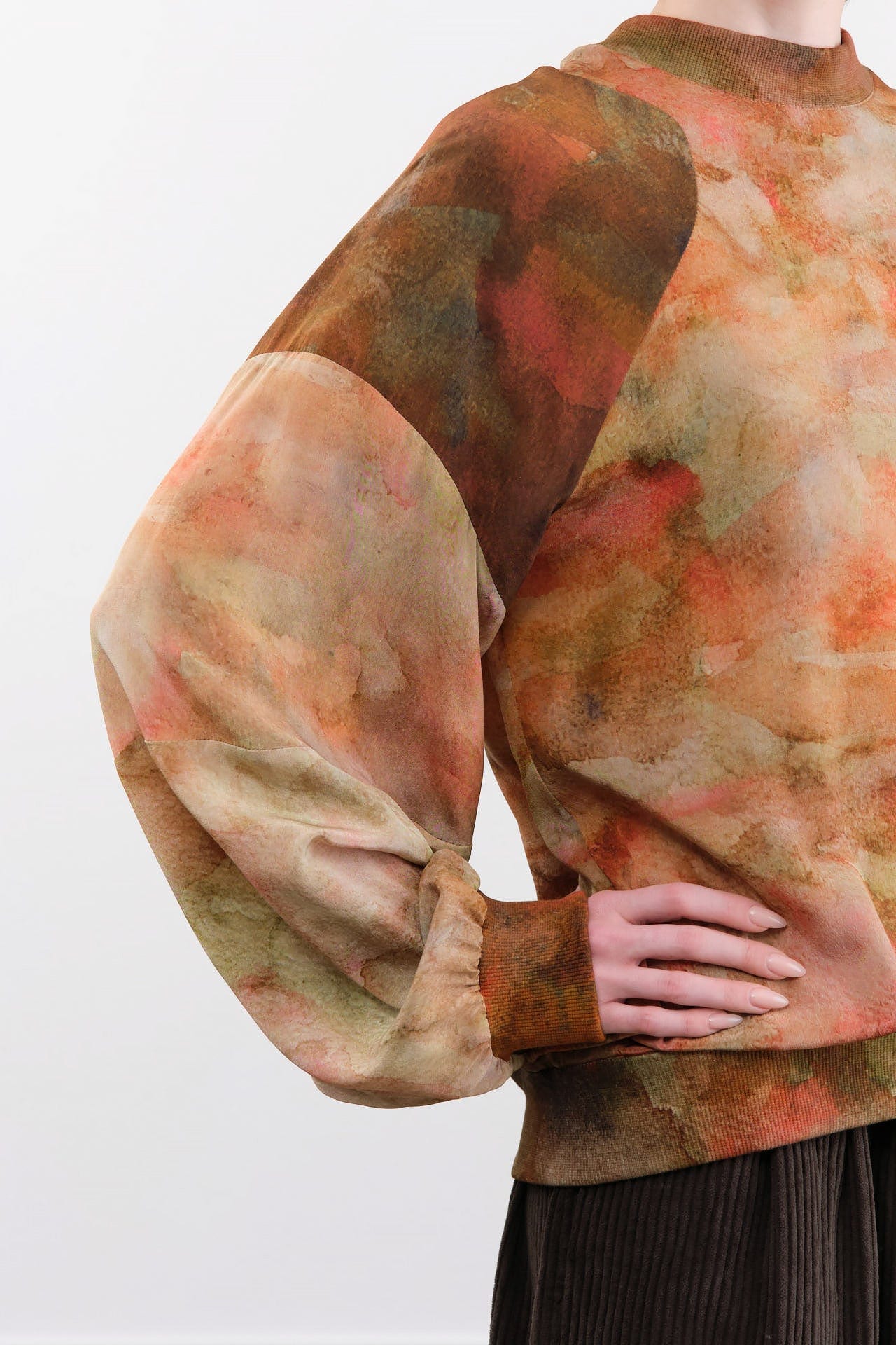 The Silk Pullover in Print 5, made from 100% organic silk, features ribbed cuffs, a neckline, and a bottom band, complemented by raglan sleeves and a drop shoulder design for a modern look. The oversized fit drapes gracefully, while the digitally printed design adds a unique flair to your wardrobe. Perfect for the transitional season, this piece is warm and cozy.