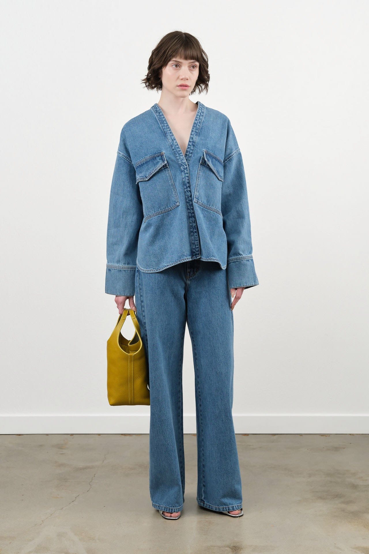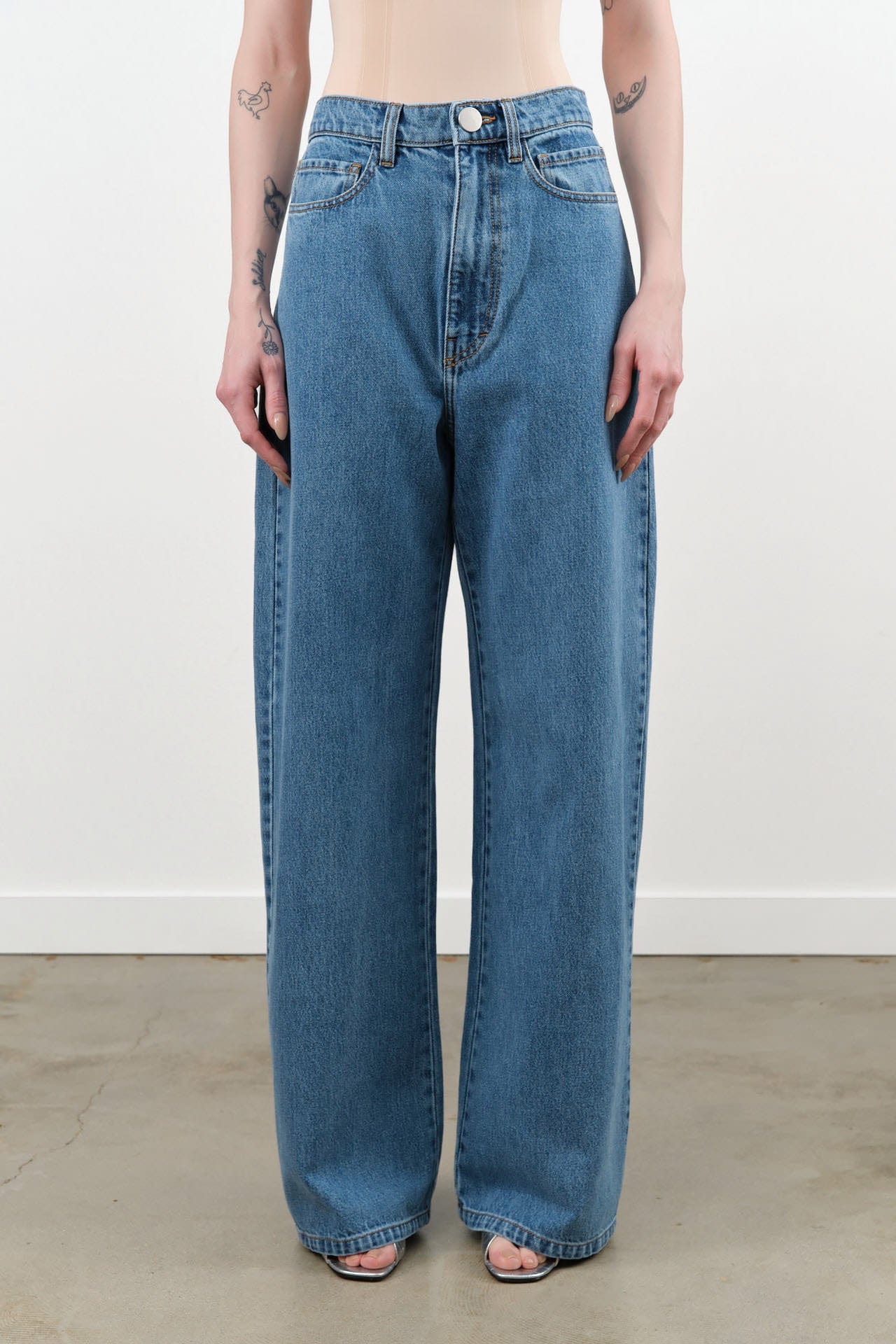 The Pullos Jeans are made from light-wash blue denim for a chic and modern aesthetic. These wide-leg trousers feature a flattering high-rise waist and a contemporary bow leg design, ensuring a flattering and chic silhouette. With practical front and back patch pockets, these jeans seamlessly blend functionality with fashion, making them a must-have.