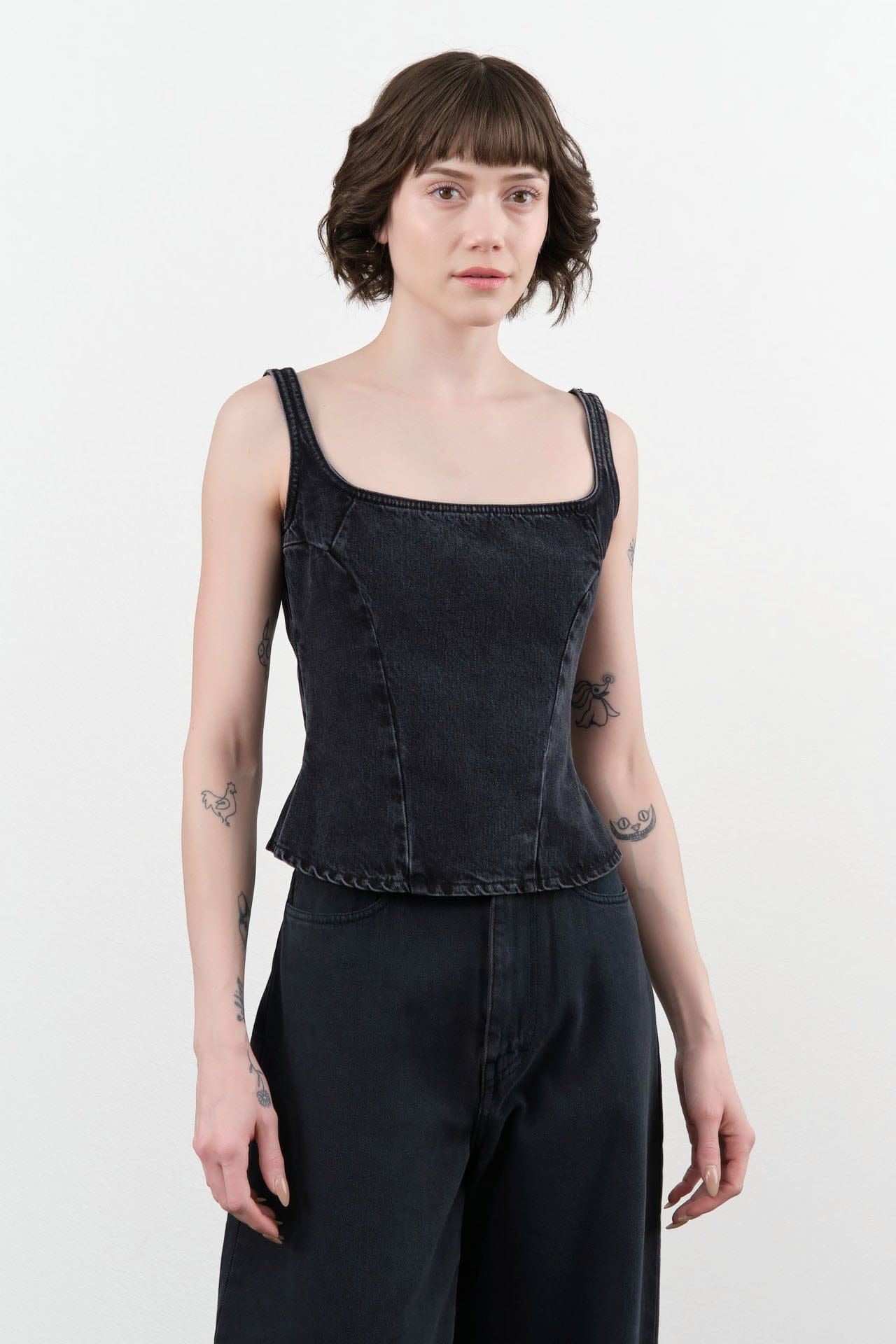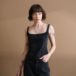 The Quiet Corset is a cotton structured top that combines elegance with comfort. Featuring a wide scoop neck and delicate, thin straps, this corset-style piece is designed to highlight a feminine silhouette with its structured seams throughout the bodice. The convenient back zipper closure ensures a secure fit, while small side slits add a charming, feminine touch and allow for ease of movement.