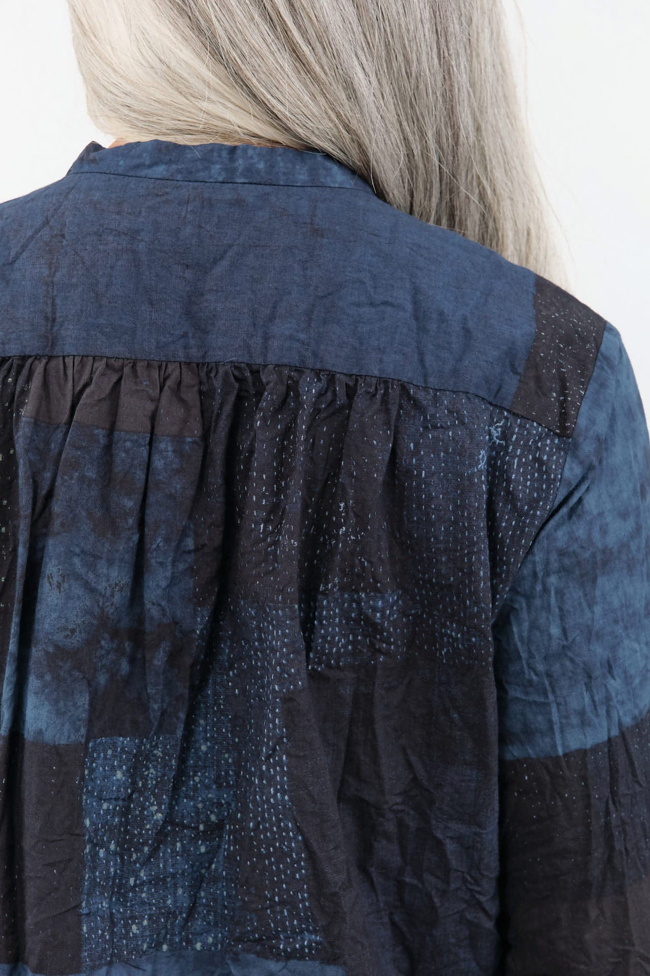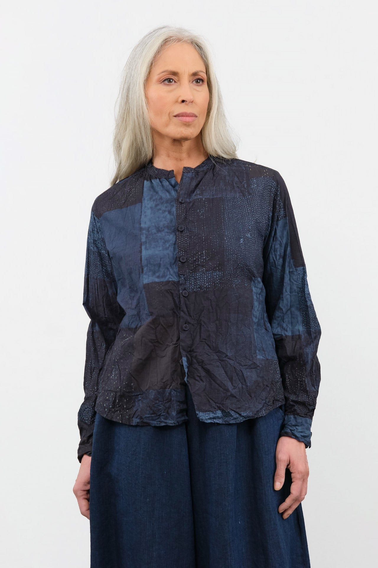 The Tsugihagi Print Blouse is a beautiful cotton top that features a chic band collar and a polished button-up front. This blouse showcases a unique crinkled texture throughout, adding depth to your look. The refined button cuffs and eye-catching colorblock design make it a versatile piece that highlights the art of fashion.