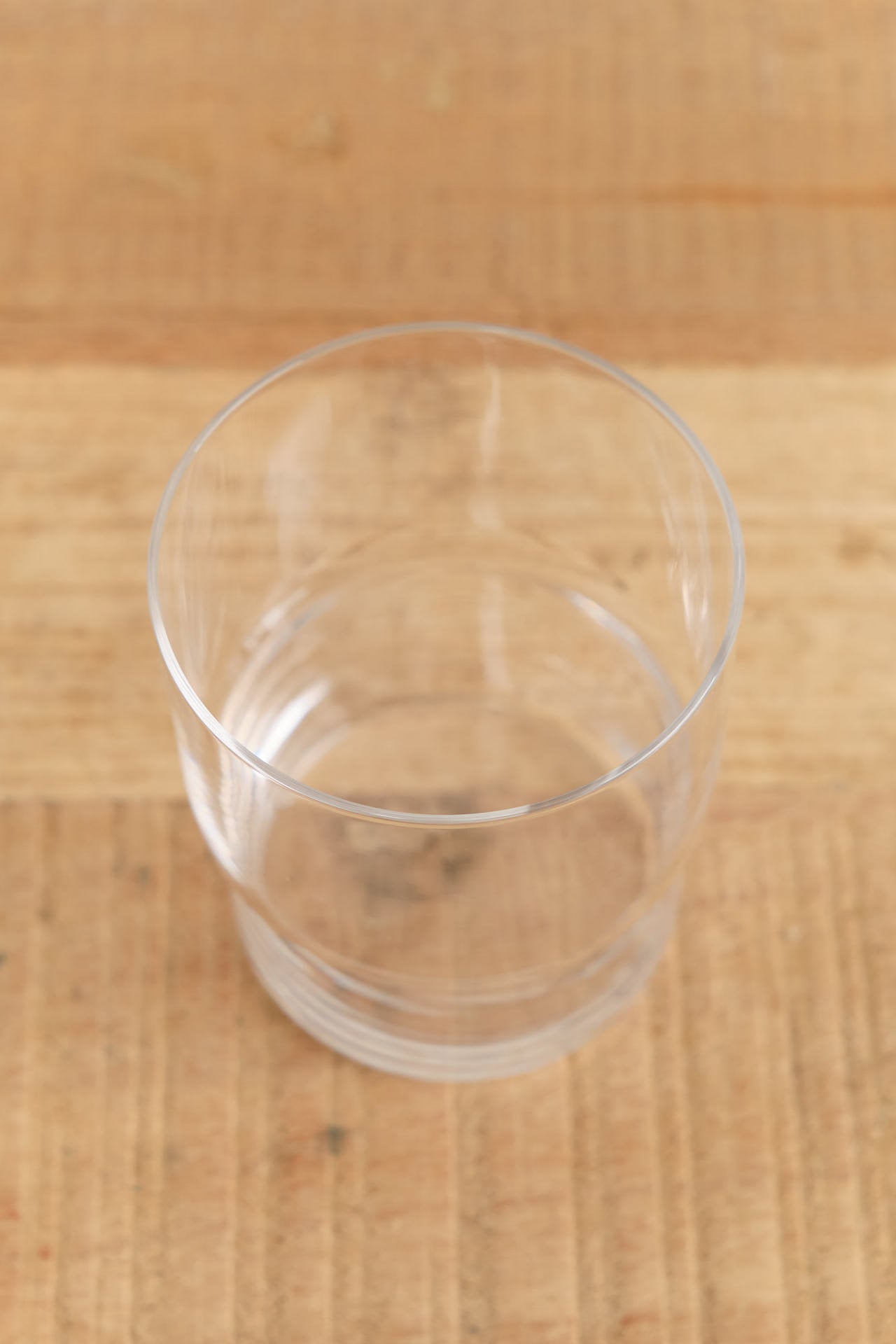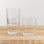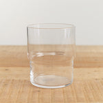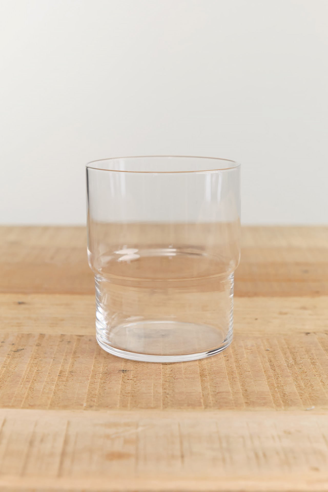 The Platinum Fino Tumbler is a glass tumbler that features a center ridge for a comfortable grip. It's also stackable for convenient storage and is lightweight and handcrafted for a unique touch.
