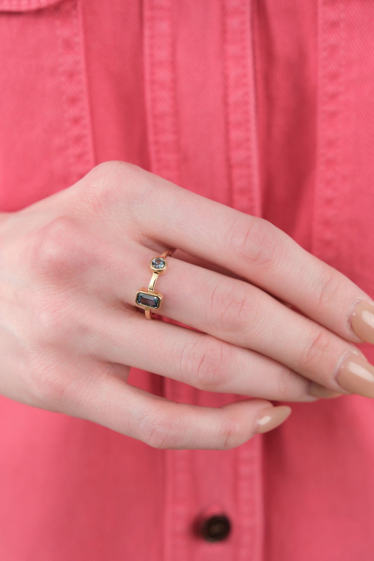 The Round Toi Et Moi Ring, inspired by the French phrase meaning "you and me," features stunning Montana Sapphires elegantly set in a delicate round shape and emerald cut design. Made with a delicate 14K Yellow Gold thin band, this ring embodies sophistication and modern elegance. Embrace the beauty of this timeless piece and let it shine as a symbol of love and connection.
